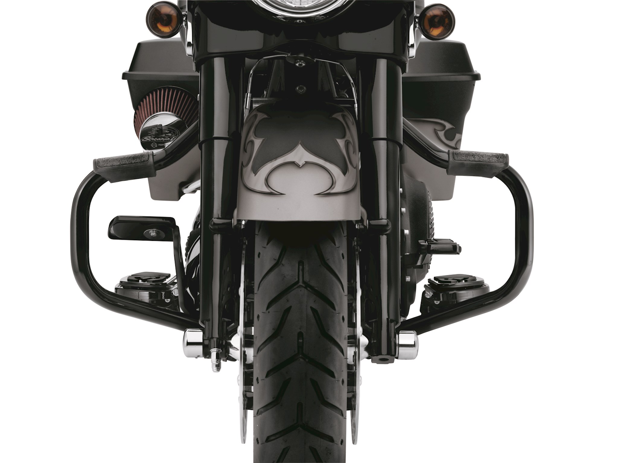 Combine classic shape and modern function for a unique twist on engine protection. The flow of this engine guard complements the bike's traditional style while the gracefully curved upper section incorporates highway pegs into the shape. The integrated rubber pads offer a comfortable and slip-resistant cushion for your feet while traveling the open road. One-piece engine guard kit includes all required mounting hardware. Fits '09-later Touring models (except Road Glide®). Does not fit models equipped with fairing lowers.