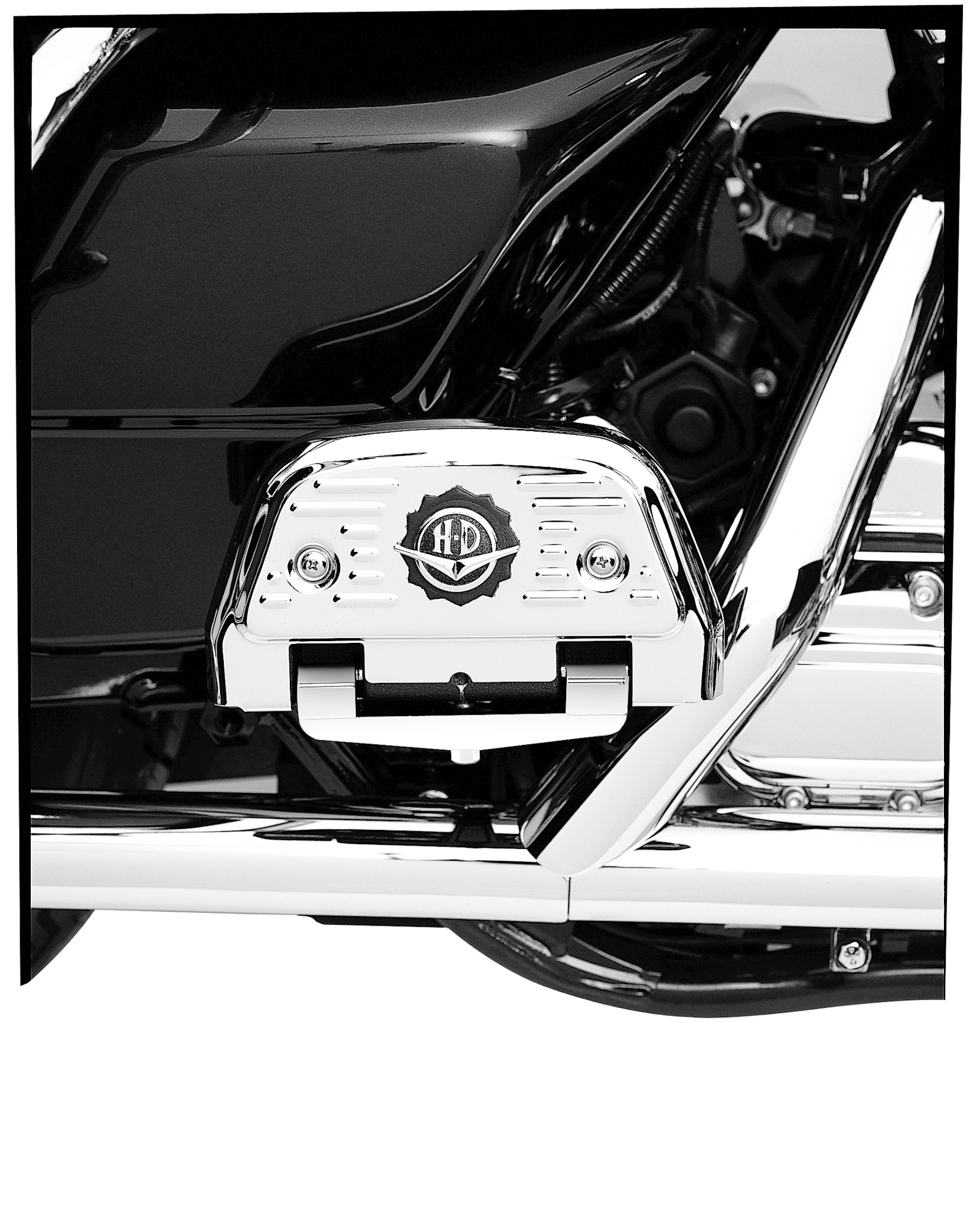 The latest in the family of Road King® Classic inspired accessories, this chrome-plated steel footboard cover features a chrome die-cast Road King Classic medallion with black accents and a stylish leather accent piece. Mounting hardware included.