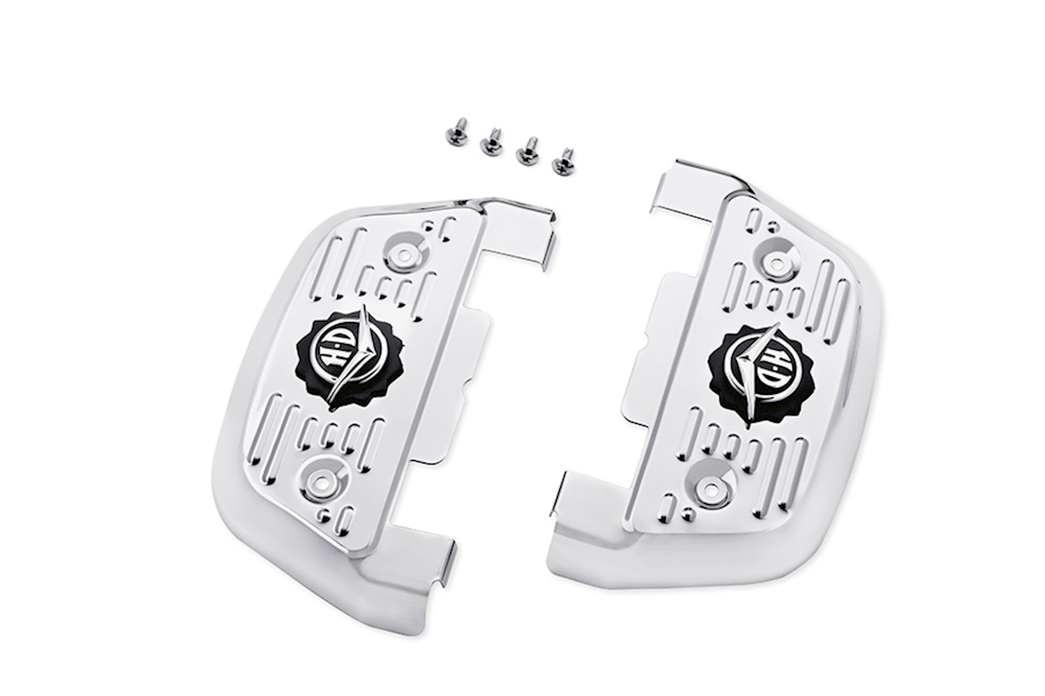 The latest in the family of Road King® Classic inspired accessories, this chrome-plated steel footboard cover features a chrome die-cast Road King Classic medallion with black accents and a stylish leather accent piece. Mounting hardware included.