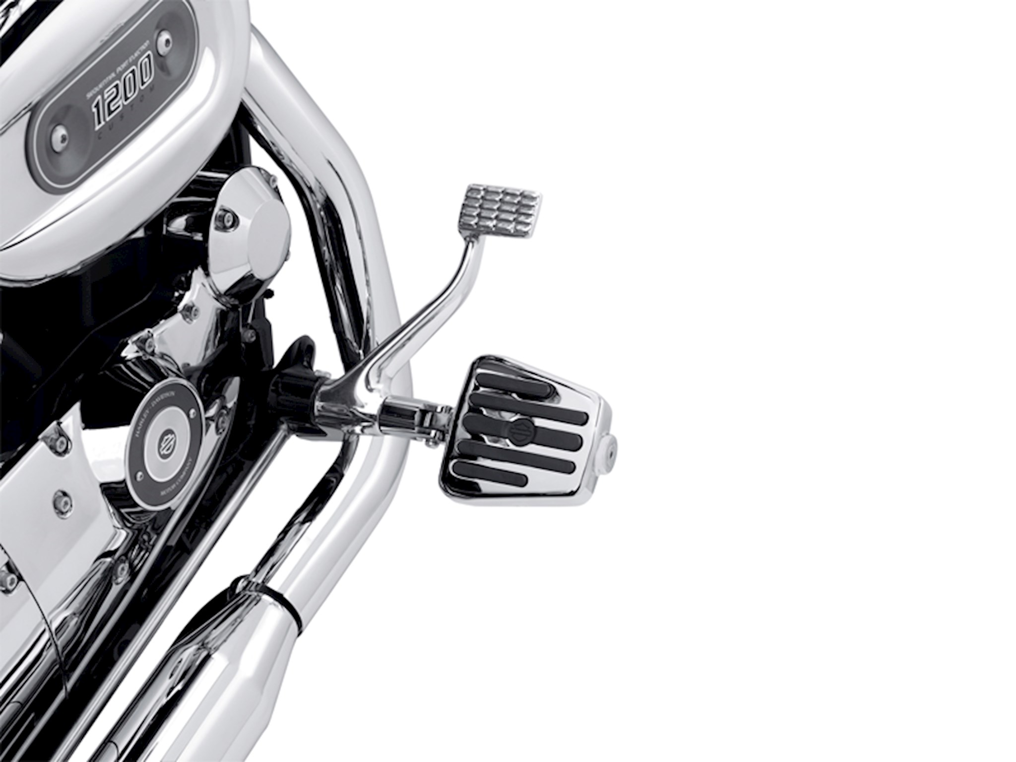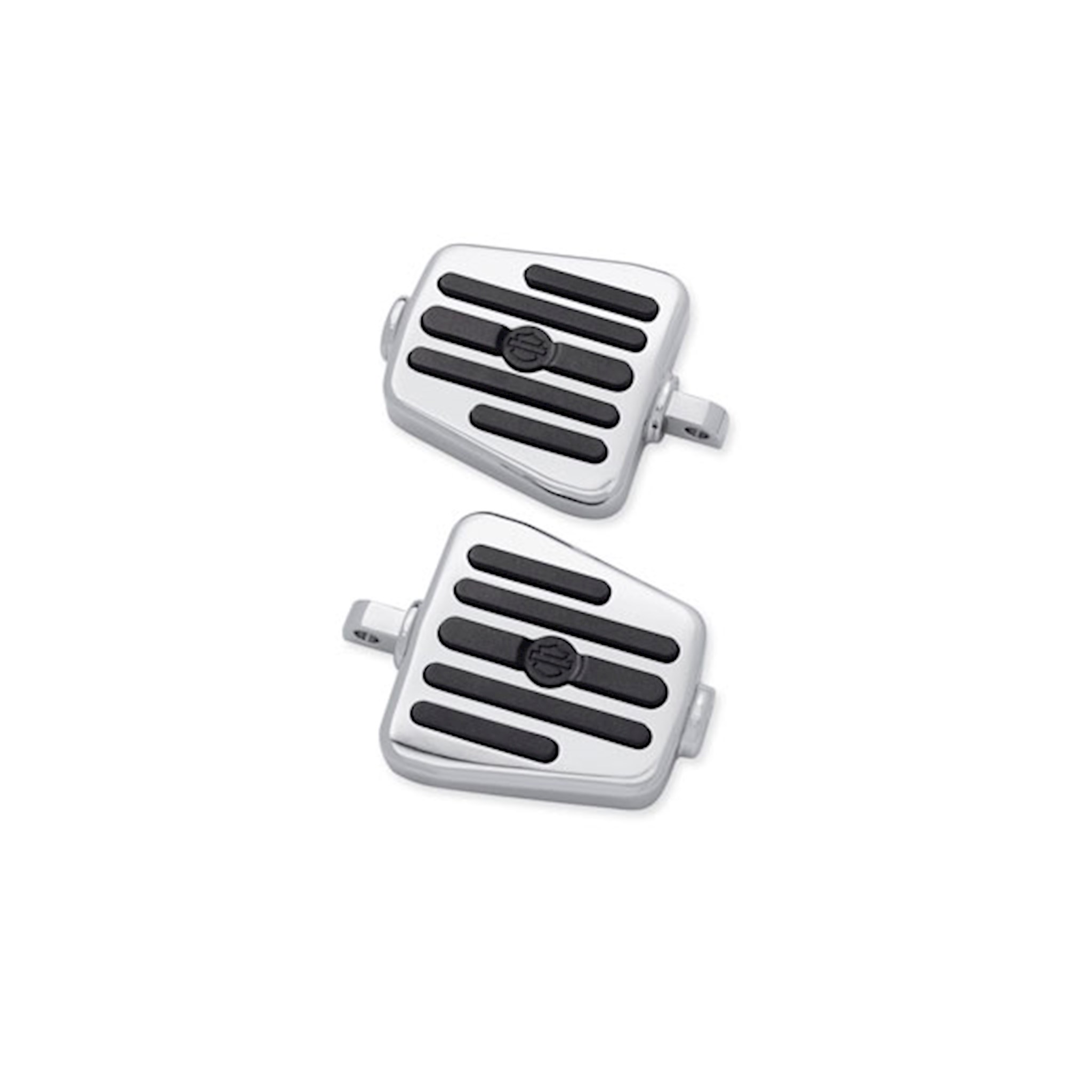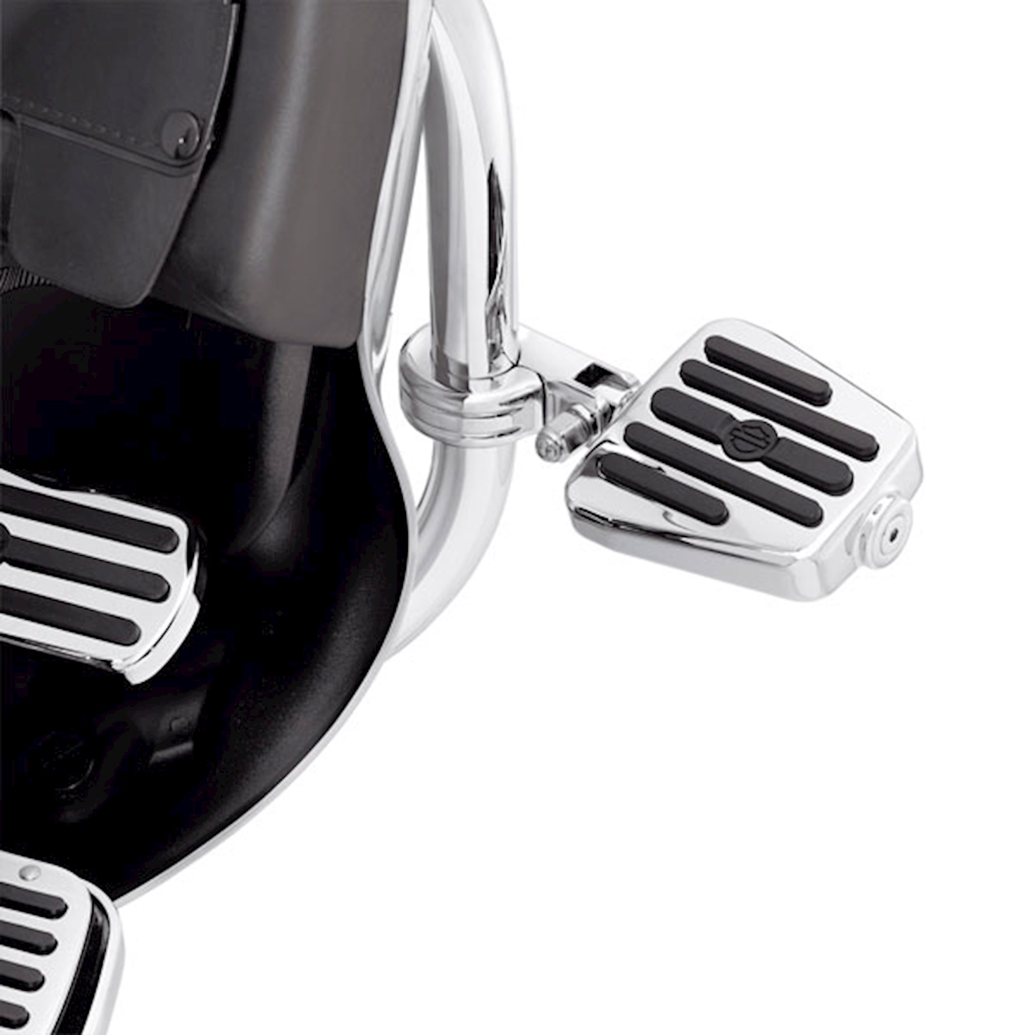 This Mini Footboard Kit can be installed in place of traditional footpegs and provides a little additional leg support and more options to move your feet around on a long run. Mini Footboards mount to standard H-D® style footpeg supports, and can be used in many rider and passenger applications. A little larger than a bicycle pedal, Footboards can be pivoted to the proper angle for maximum riding comfort. The sole-gripping horizontal black rubber bands complement the mirror-chrome finish and add vibration isolation and a rich appearance to the pegs. Complete the look with Shifter Pegs and Brake Pedal Pads from the Chrome and Rubber Collection.