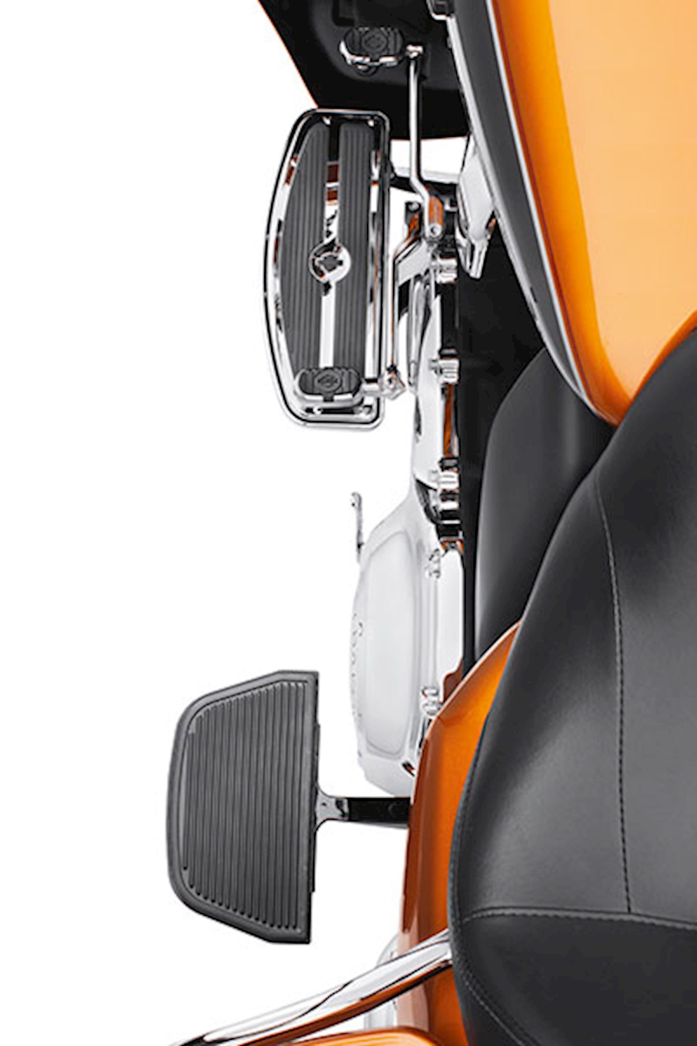 This mount kit permits replacement of the Original Equipment passenger footboards with footpegs or mini footboards, and moves the passenger's foot rearward and inward to give the rider more space between the rider footboard and the passenger foot support. The new position clears the path for your feet to ease walking the bike in and out of parking spaces. When folded, the pegs are tighter to the bike to reduce the chance of contacting the passenger foot support with your calf. Original equipment on FLHTCUL and FLHTKL models, this Footpeg Mount Kit is the ideal solution for short-limbed riders. Kit includes left and right mount, and required installation hardware. Male-mount style passenger footpegs or mini-footboards sold separately.