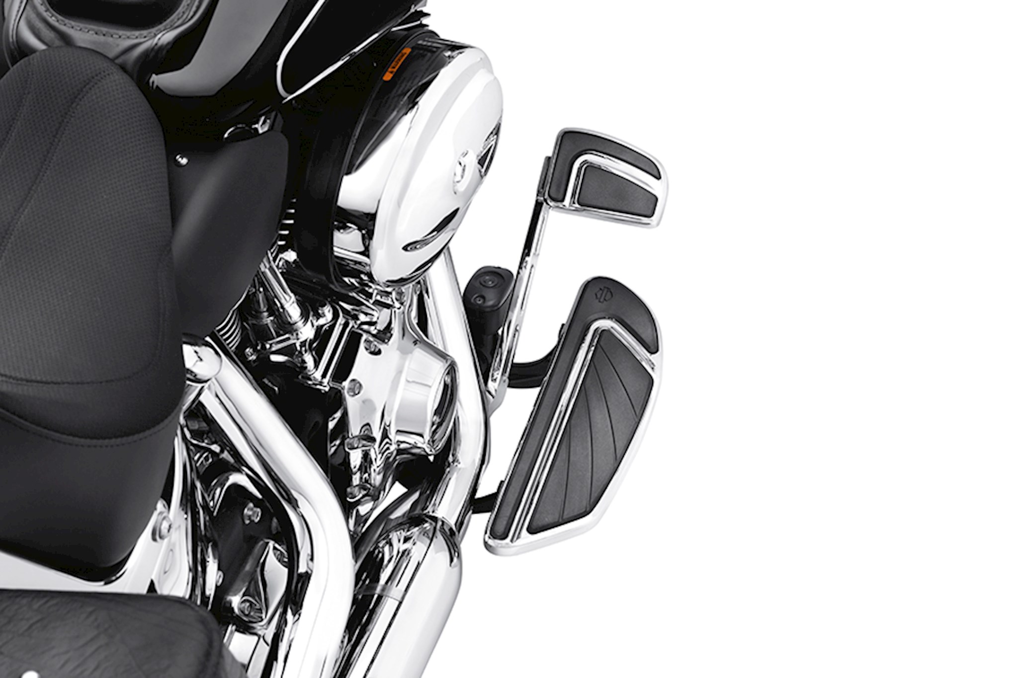 Comfortable and stylish, these fighter-wing shaped footboards add an elegant finish to your ride. The complete kit includes chrome delta wing-shaped footboard pans with vibration-isolated inserts for a fatigue-free ride. The black rubber pads feature a deep embossed Bar & Shield logo and rear-sweeping traction grooves.