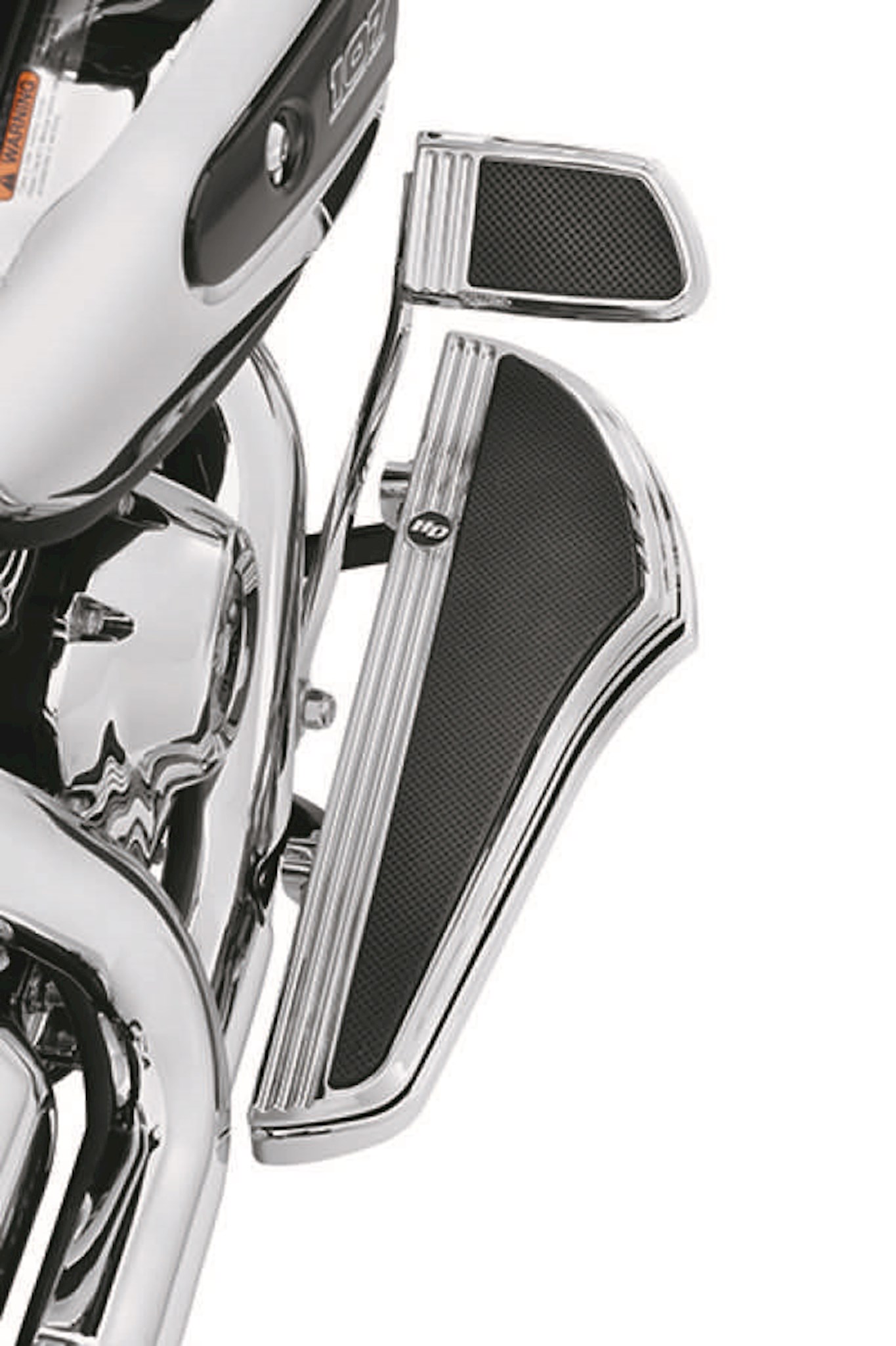 Defiance Collection - Chrome Dare to be bold. Dressed in luxurious chrome, this complete hand and foot control assortment raises the customization bar. Defined by sweeping curves and accented with deep longitudinal lines and a contemporary “H-D” logo, the Defiance Collection features rich textured black rubber traction surfaces set in a field of mirror chrome. Defiance Footboard Kit - Chrome These extended length sweeping shark-fin footboards are shaped to maintain a long and lean appearance while offering plenty of options for foot repositioning while riding. The aluminum footboards feature an elegant perforated rubber pad recessed into the surface, surrounded by deep grooves and a contemporary “H-D” logo. Kit includes left and right boards.