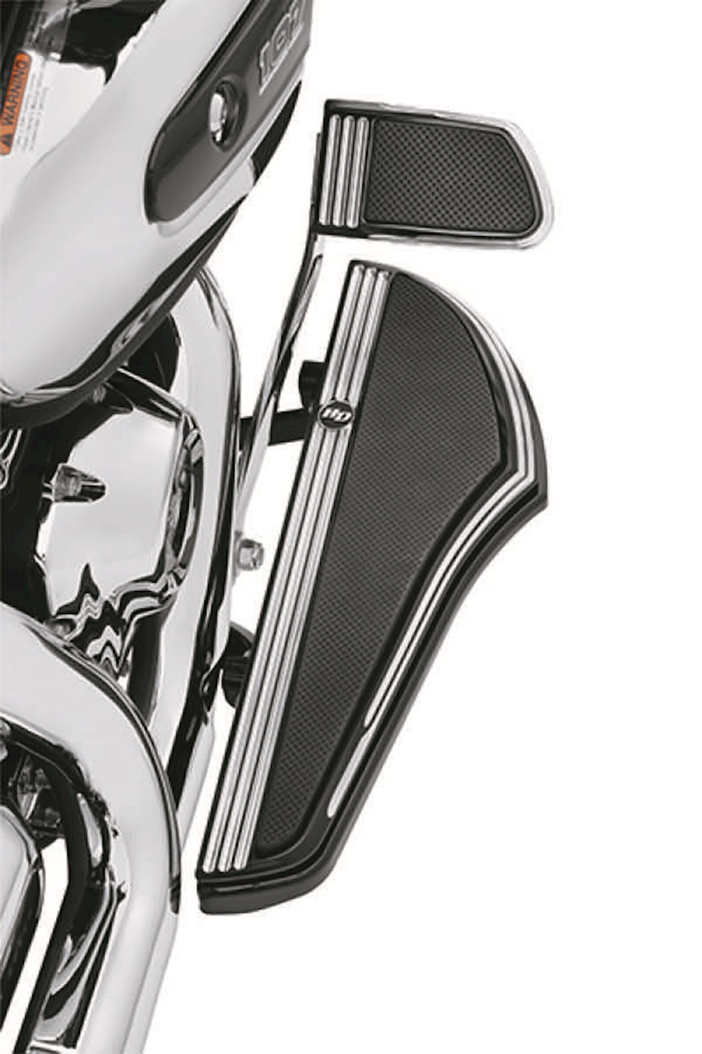 Defiance Collection - Black Machine Cut Anything but traditional, this complete collection of hand and foot controls refuses to conform to everyday norms. The sweeping curves and perforated rubber define the look, and the rich contrasting finishes set the tone. The machine-cut Defiance Collection features deep grooves milled into the black anodized surface that exposes the shimmering aluminum below. The finished design complements almost any customizing style. Defiance Footboard Kit - Black Machine Cut These extended length sweeping shark-fin footboards are shaped to maintain a long and lean appearance while offering plenty of options for foot repositioning while riding. The aluminum footboards feature an elegant perforated rubber pad recessed into the surface, surrounded by deep grooves and a contemporary “H-D” logo. Kit includes left and right boards.