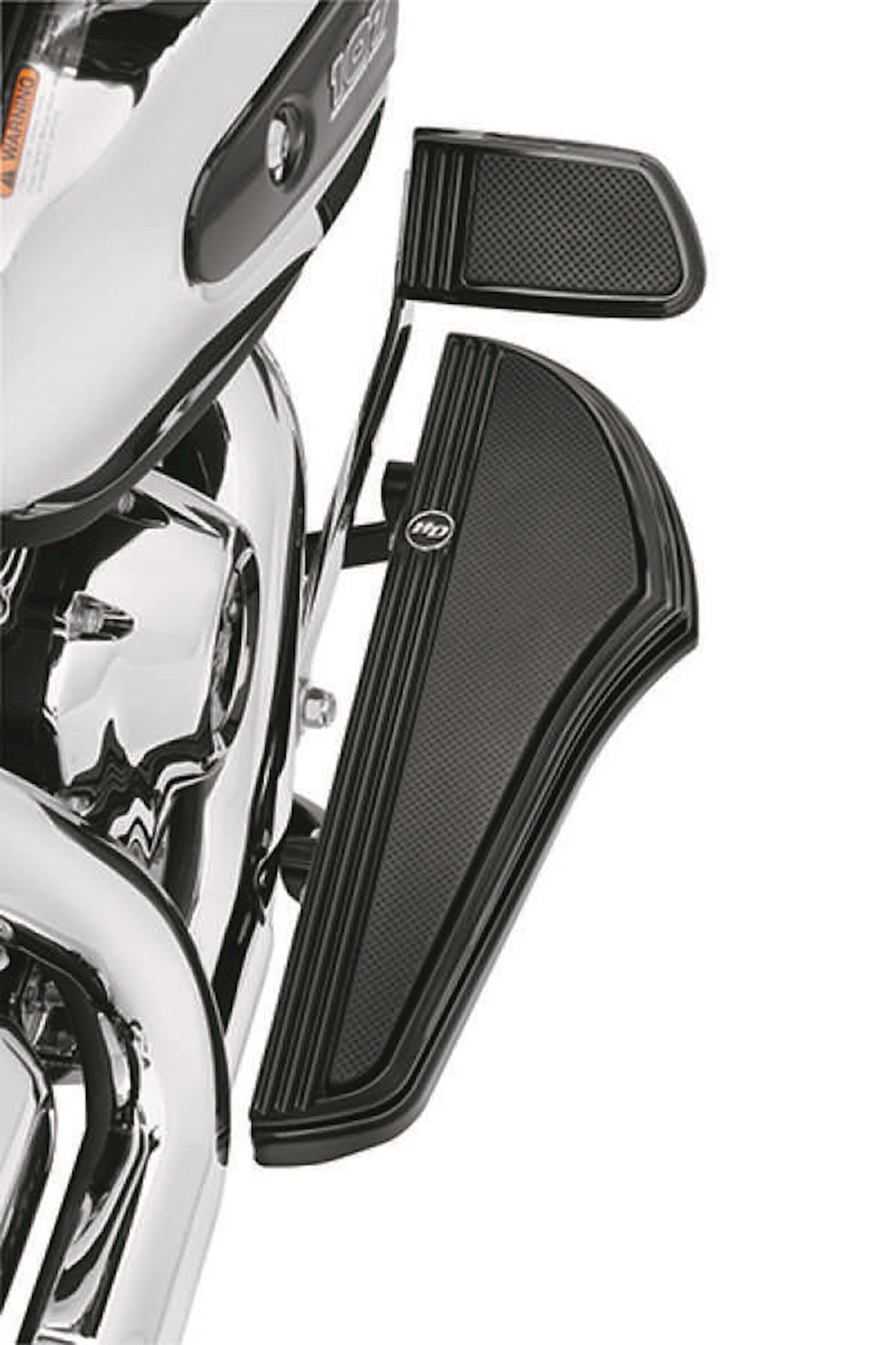 Defiance Collection - Black Anodized Show your complete disregard for the rules. Defined by sweeping curves, this complete assortment of hand and foot controls feature a rich “tuxedo black” finish that is the perfect complement to your sinister ride. The design incorporates a field of textured black rubber surrounded with deep longitudinal lines, and is finished with a contemporary “H-D” logo. The complete Defiance Collection sets a new rebellious direction in customizing. Defiance Footboard Kit - Black Anodized These extended length sweeping shark-fin footboards are shaped to maintain a long and lean appearance while offering plenty of options for foot repositioning while riding. The aluminum footboards feature an elegant perforated rubber pad recessed into the surface, surrounded by deep grooves and a contemporary “H-D” logo. Kit includes left and right boards.