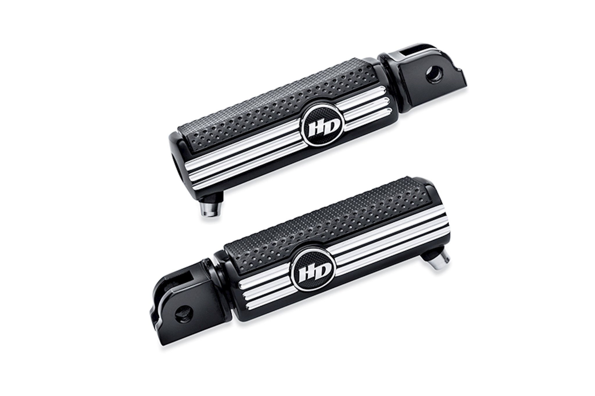 Topped with high-traction rubber, these custom aluminum footpegs feature a pattern of deep lateral grooves and a stylized H-D logo for a modern sleek look.