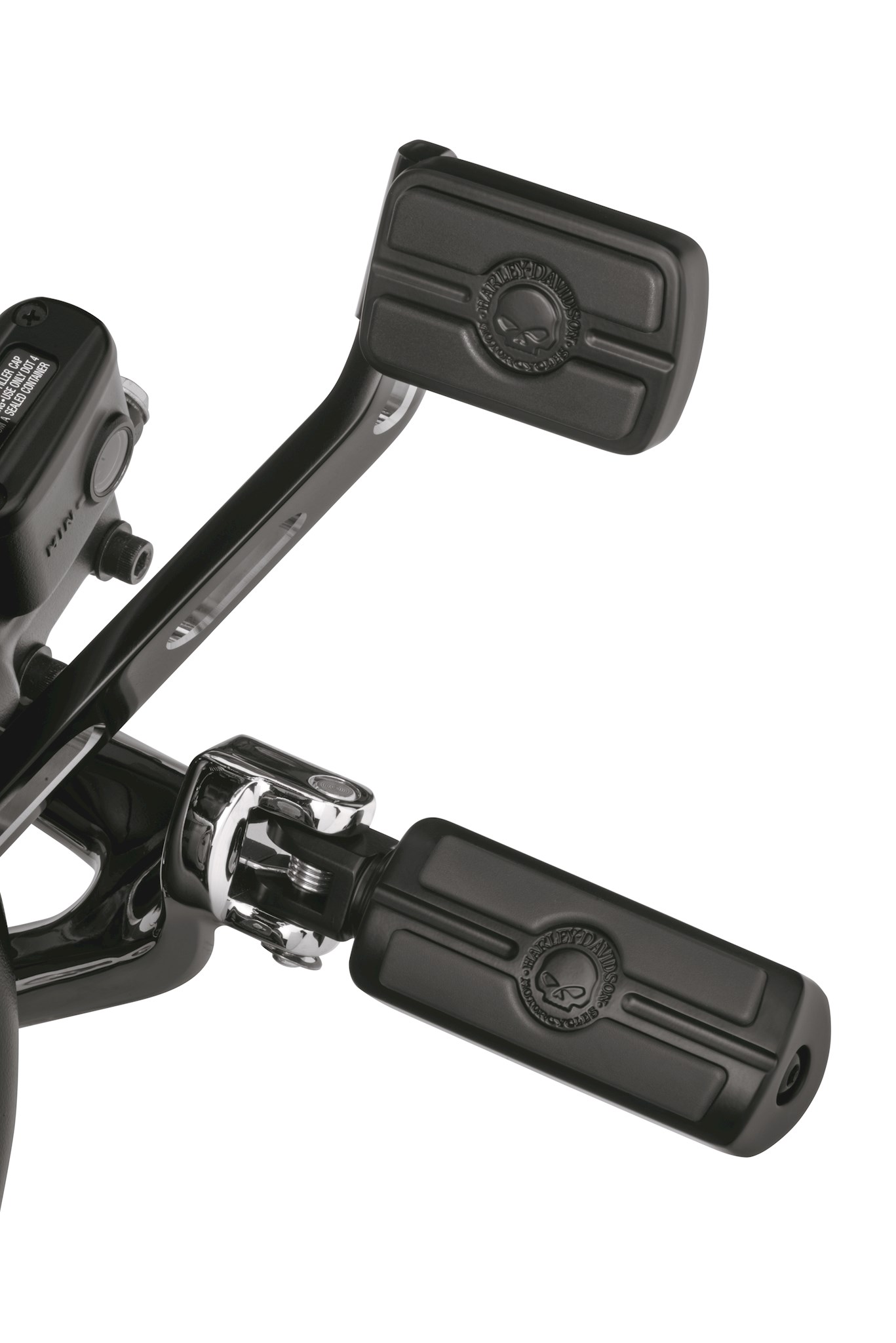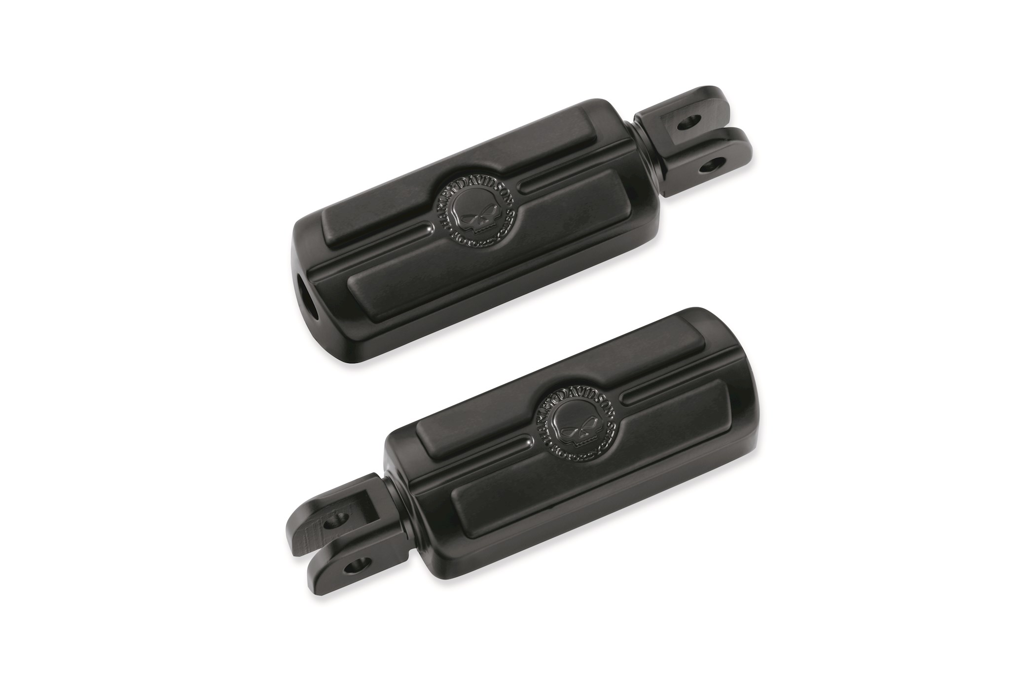 WILLIE G SKULL COLLECTION - BLACK As vast and infinite as your style, these Willie G Skull Collection Accessories are drenched in rich obsidian black and let you take the blacked-out look to a whole new level. The menacing dimensional skull and surrounding Harley-Davidson Motorcycles script add just the right touch of attitude to their clean, dark as night backdrops. Styled to complement Willie G Skull Accessory items, these obsidian black Footpegs feature a raised Willie G Skull and Harley-Davidson Motorcycles script surrounded by rich black rubber for grip and traction. Footpeg rotation is adjustable for position, so your feet ride on the rubber treads whether used as a rider, passenger or highway peg. Kit includes left and right peg.
