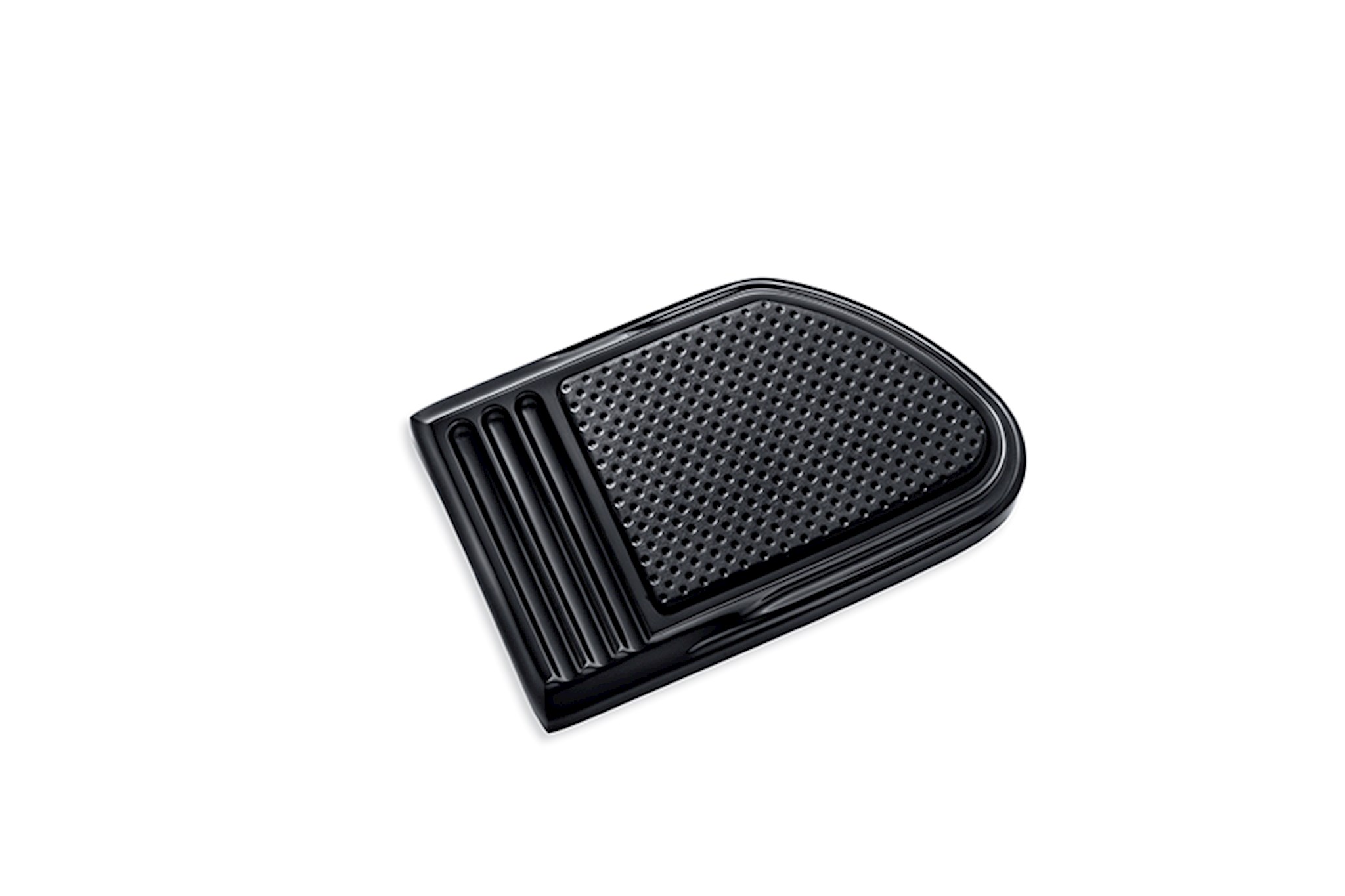 This stylish brake pedal pad features a rich black rubber panel set into the recessed surface, surrounded by deep accent grooves.