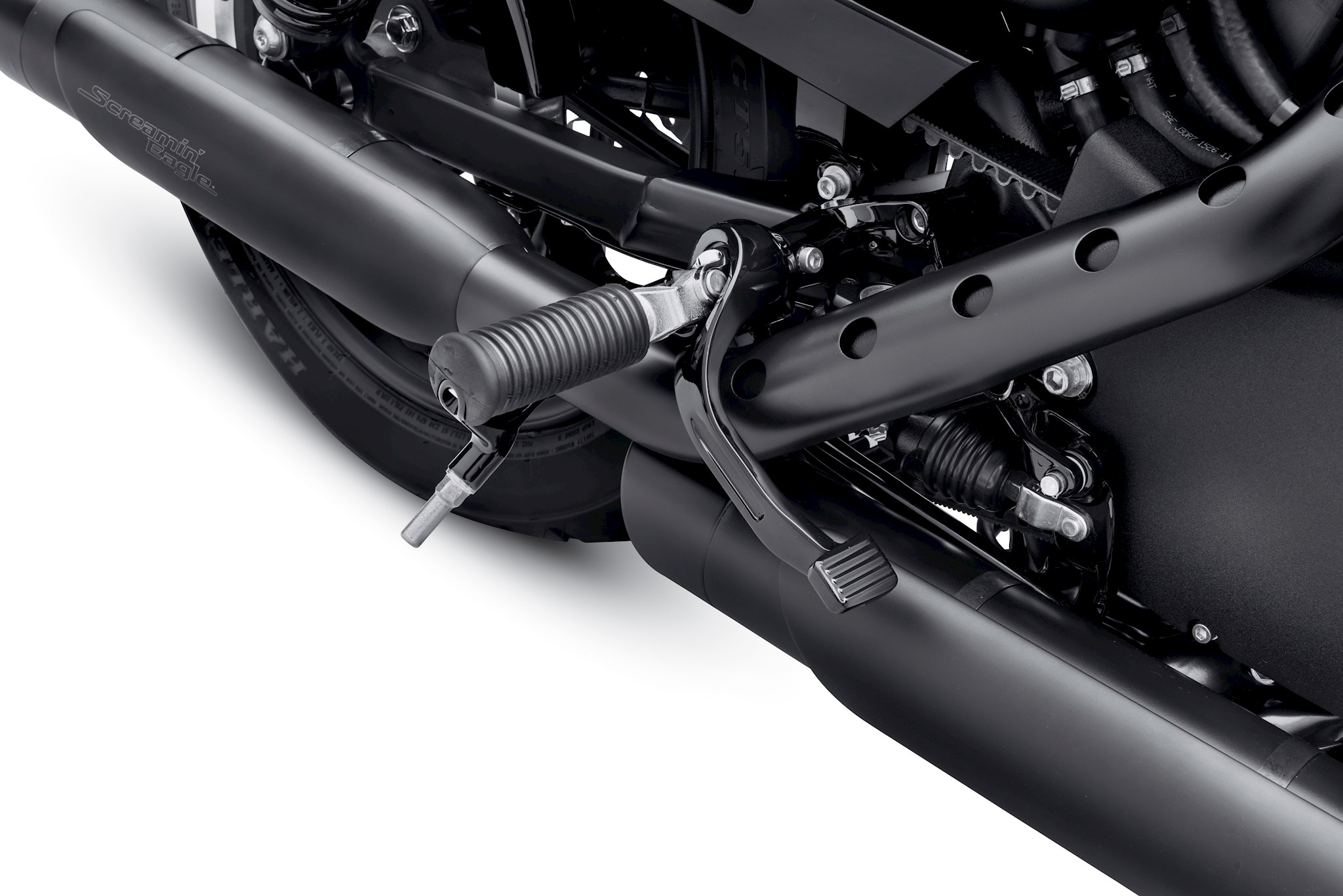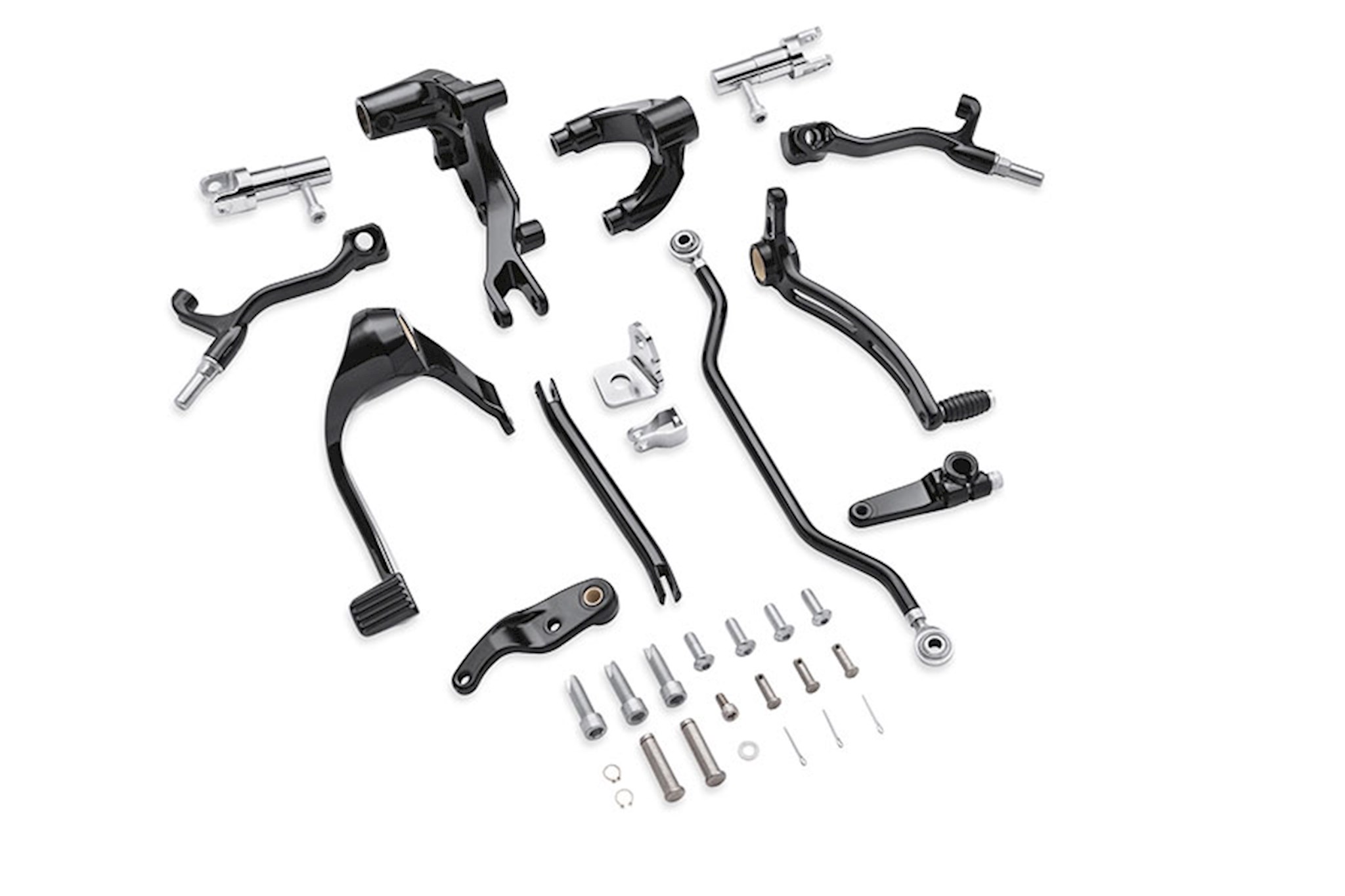 Transform the on-street profile of your Sportster model. Moving the foot controls to a rear-mounted location takes the riding position from a relaxed cruiser to a solo, aggressive, curve-carving posture. When combined with a Clip-On or Clubman Handlebar, the resulting hands-forward and feet-back profile drapes the rider over the bike and makes you feel a part of the machine. This complete gloss black Rear Set Control Kit includes everything you need to move the brake and shift lever to the rear passenger position. This unique kit maintains the standard 1-down and 4-up shift pattern, and can be installed with the Original Equipment low staggered exhaust system. Kit reuses Original Equipment rider footpegs. Installation requires removal of passenger footpegs and footpeg mounts. For solo rider application only.