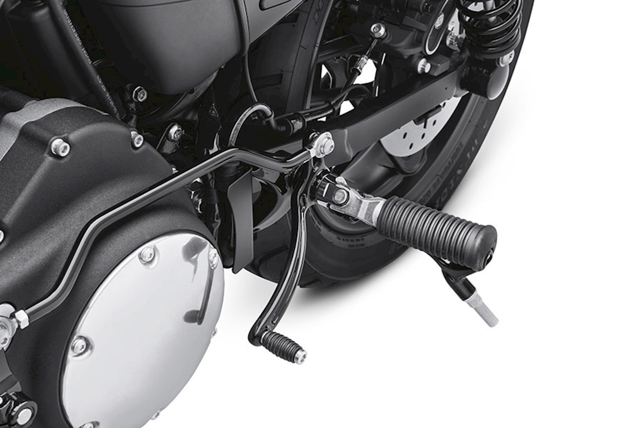 Transform the on-street profile of your Sportster model. Moving the foot controls to a rear-mounted location takes the riding position from a relaxed cruiser to a solo, aggressive, curve-carving posture. When combined with a Clip-On or Clubman Handlebar, the resulting hands-forward and feet-back profile drapes the rider over the bike and makes you feel a part of the machine. This complete gloss black Rear Set Control Kit includes everything you need to move the brake and shift lever to the rear passenger position. This unique kit maintains the standard 1-down and 4-up shift pattern, and can be installed with the Original Equipment low staggered exhaust system. Kit reuses Original Equipment rider footpegs. Installation requires removal of passenger footpegs and footpeg mounts. For solo rider application only.