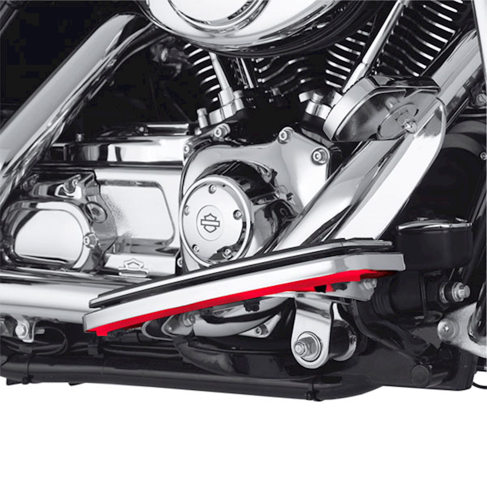 Add a rim of neon-like light to the rider footboard. This integrated red LED light and lens assembly hugs the bottom of the rider footboard and is held in place by the footboard insert isolation mounting system. The soft red glow acts as an auxiliary side marker light and casts a subtle pool of light to the ground below. The perfect complement to the Electra Glo Lighted Passenger Footboard Cover P/N 50541-03A. Kit includes left and right footboard lights, wiring harness and all necessary installation components.