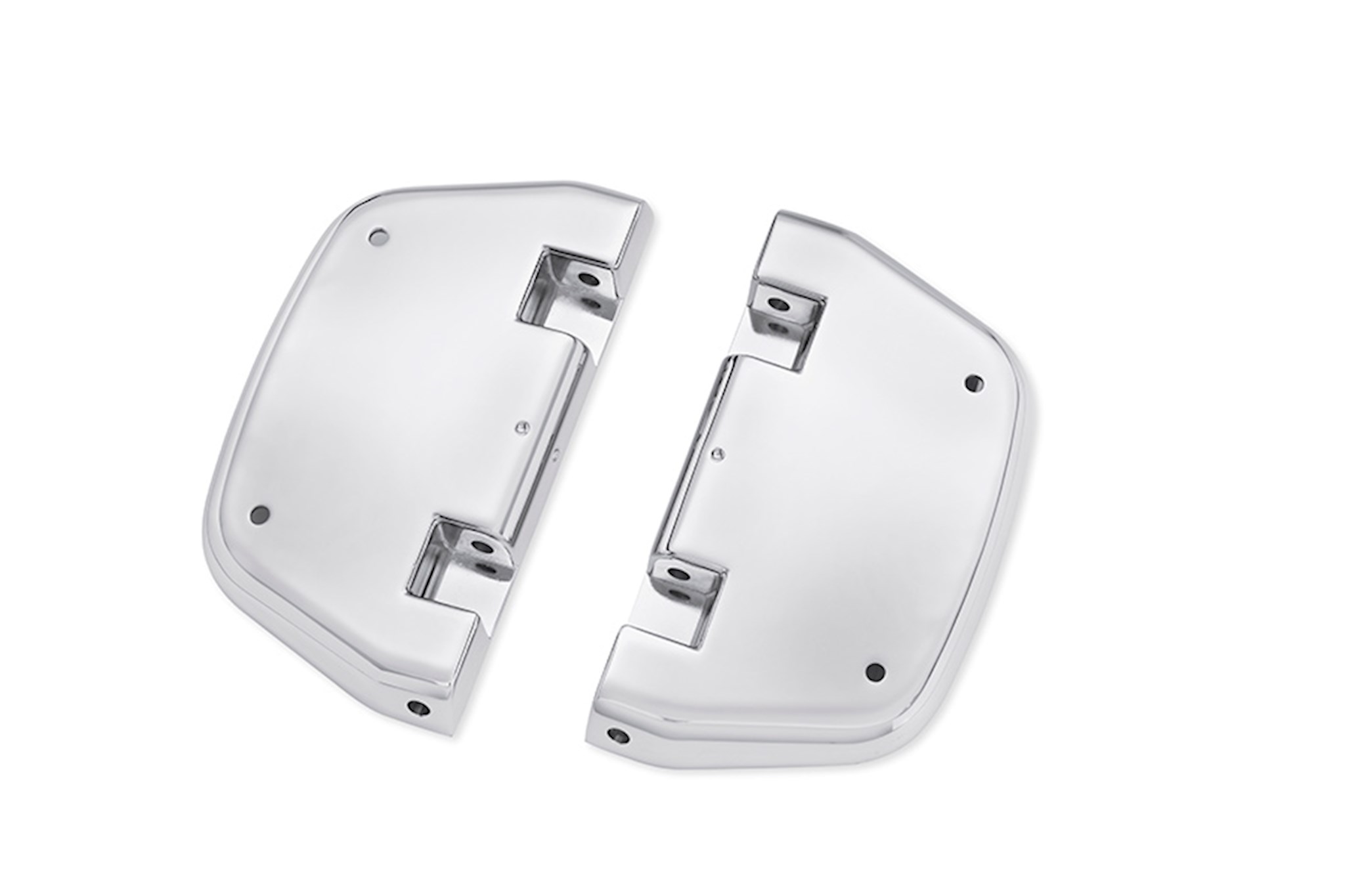 Replace the factory black painted passenger footboard with the custom look of smooth chrome. The kit includes left- and right-hand traditional D-shaped footboard pans, chrome-plated and ready to install with your Original Equipment hardware. Footboard inserts and footboard supports sold separately.