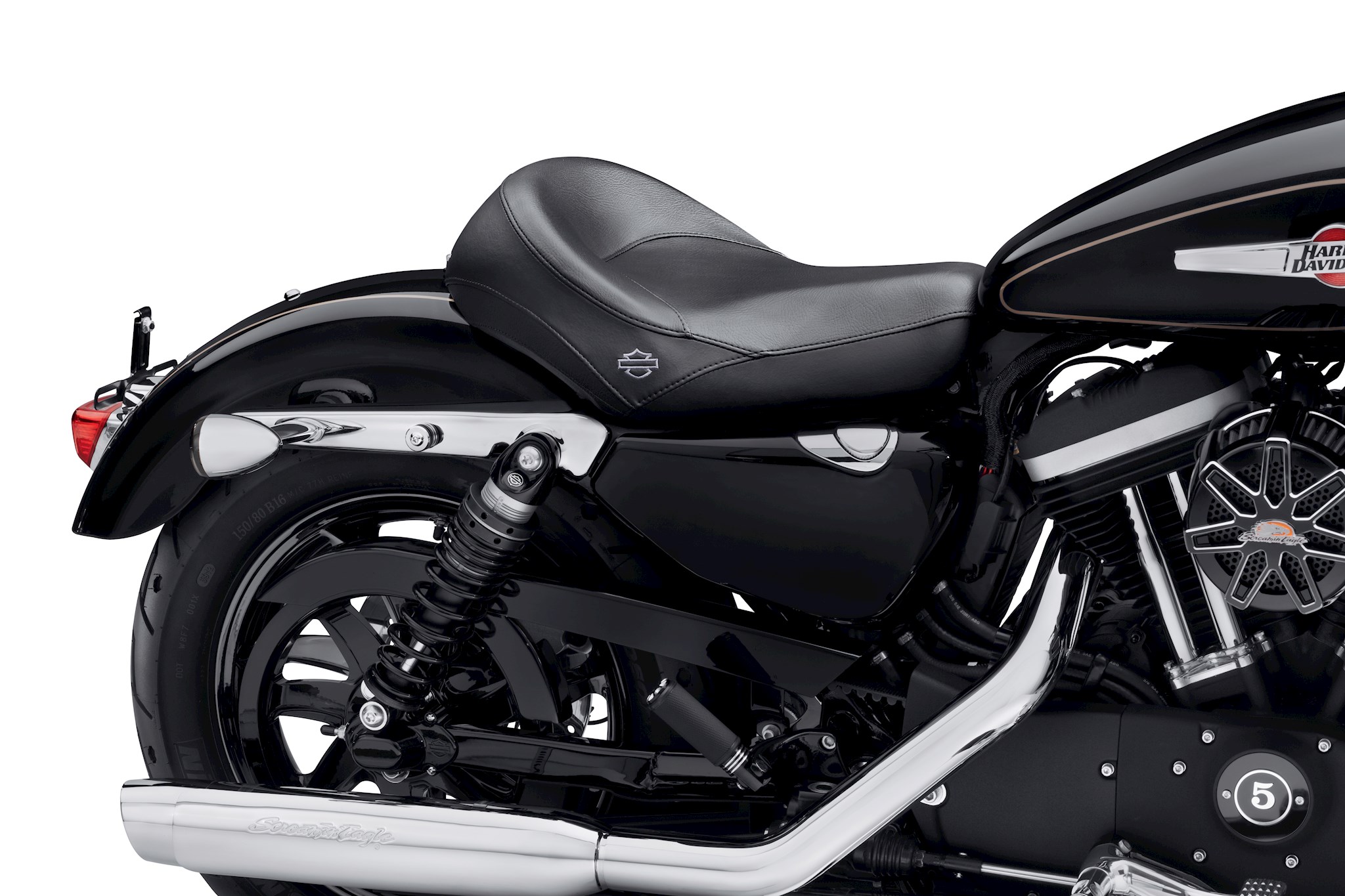 Ride sun-up to sun-down in comfort and style. The Sundowner™ Solo Seat's shape and foam density were developed and refined during hundreds of hours of test rides and ergonomic evaluations. The unique seat features a deep bucket design that cradles the tailbone and provides back support for the rider. The narrow nose of the seat was sculpted to bring the legs closer together, and to look great with any size Sportster fuel tank. The seat is constructed with premium textured vinyl surfaces for comfort and durability, and features embroidered Bar & Shield logos for style. For two-up riding, simply add the comfortable Sundowner Passenger Pillion P/N 52400121.