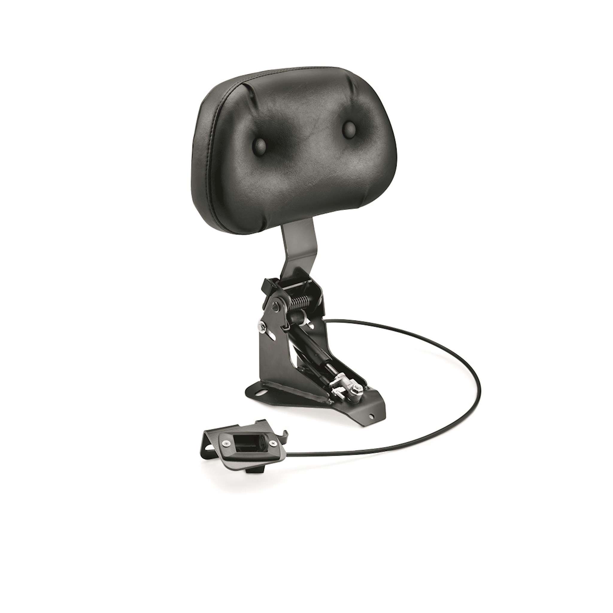 Add support for the long haul. With one quick pull from the integrated gas spring, you can instantly adjust the riding position through a 30-degree range. The backrest pad features a sleek shape that provides full lower back support without pushing the rider forward, and a slim profile that offers the passenger a few more inches of space. The backrest features a pull knob-activated, five-position, 1.5" height adjustment. The backrest can be easily removed, and folds down to allow easier passenger mounting. Fits '97-later Touring and Trike models equipped with many one-piece slotted seats. Separate purchase of compatible accessory seat required for FLTRSE3 and FLHXSE/2 models and recommended for '09-'10 FLHX, FLTR, FLTRX, FLHR and FLHRC models. Installation requires separate purchase of model-specific Mounting Kit.