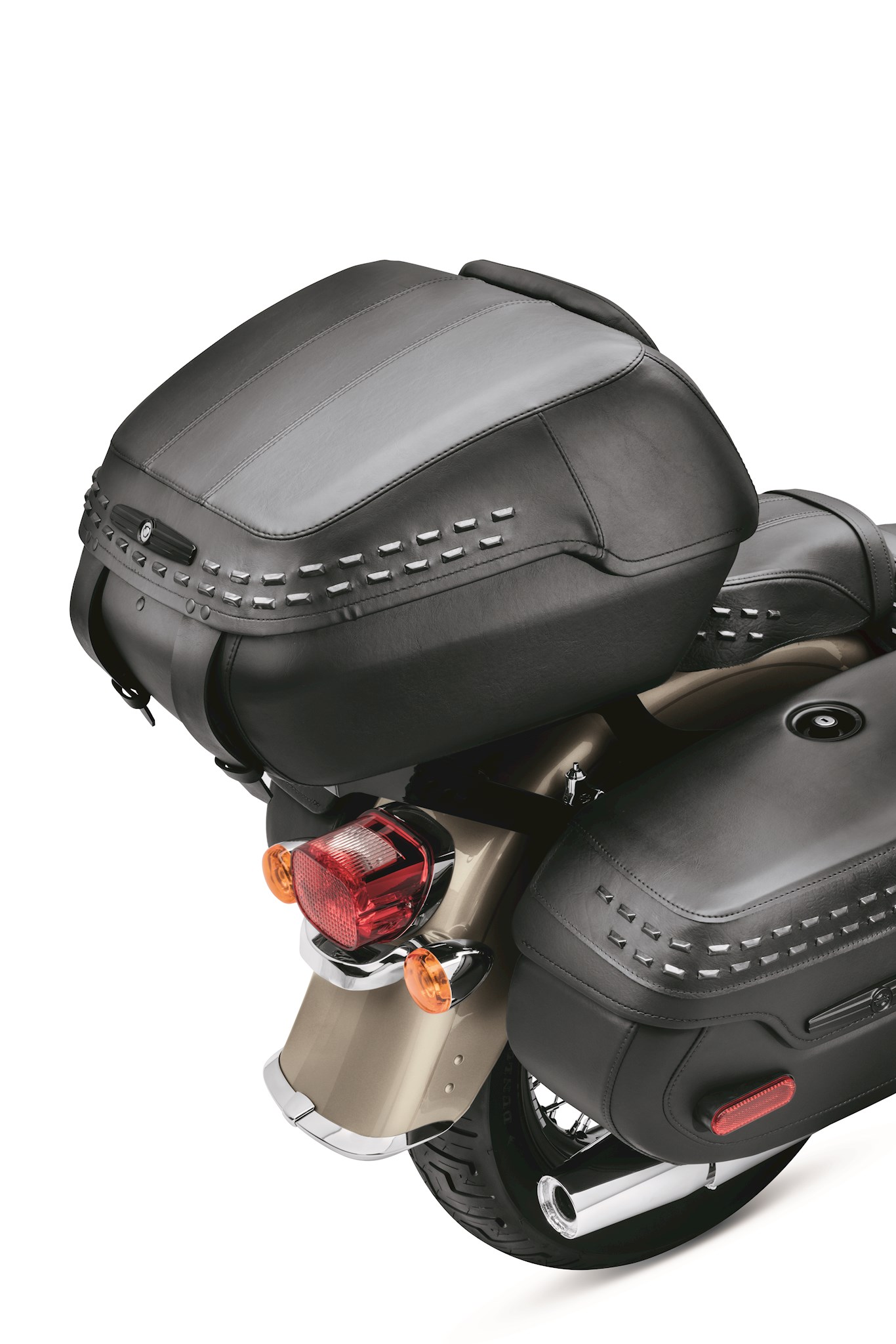 Accented with twin rows of blacked-out rectangular studs, this Tour-Pak is the perfect match for the seats and saddlebags on your Heritage Softail® model. Wrapped in rich long-wearing vinyl, this rigid-body Tour-Pak features a lockable lid for added security. Kit includes matching backrest pad. Luggage capacity: 2,580 cubic inches. Dimensions: 18.5" W x 18.75" D x 12.25" H. Mounting racks and docking kits sold separately.