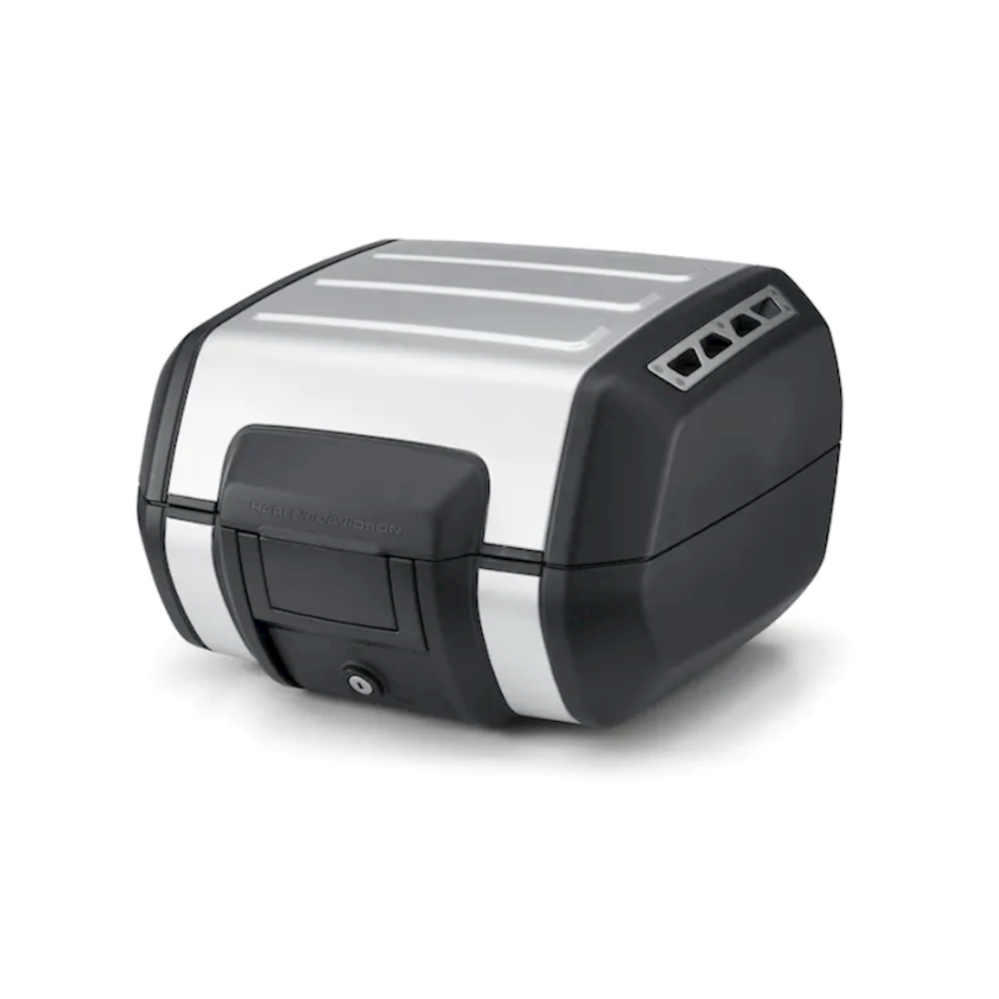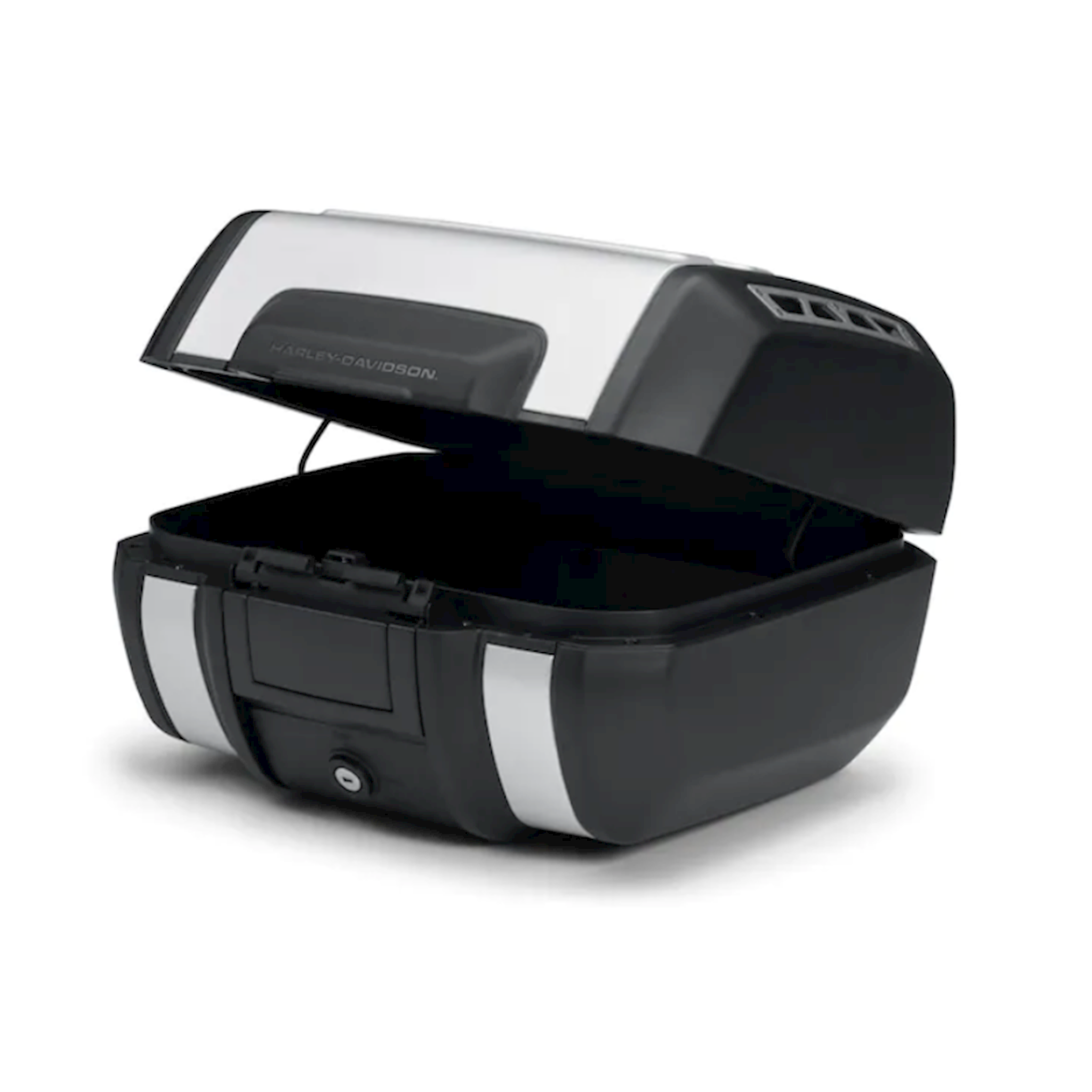 Top case and its mount (sold separately) are designed to maximize loading capacity without compromising ride and handling. • With a gasket in the lid, each piece is waterproof and passes a rigorous Harley-Davidson™ water intrusion test. • An integrated handle makes it easy to carry off the bike. • Locks are keyed to the motorcycle ignition. • Installation requires separate purchase of Top Case Mounting Plate P/N 53000800. • Luggage volume capacity: 2,196 cubic inches (36 liters). • Luggage weight capacity is 22 pounds (10 kg) in each case. • Integrated liner is available (sold separately).
