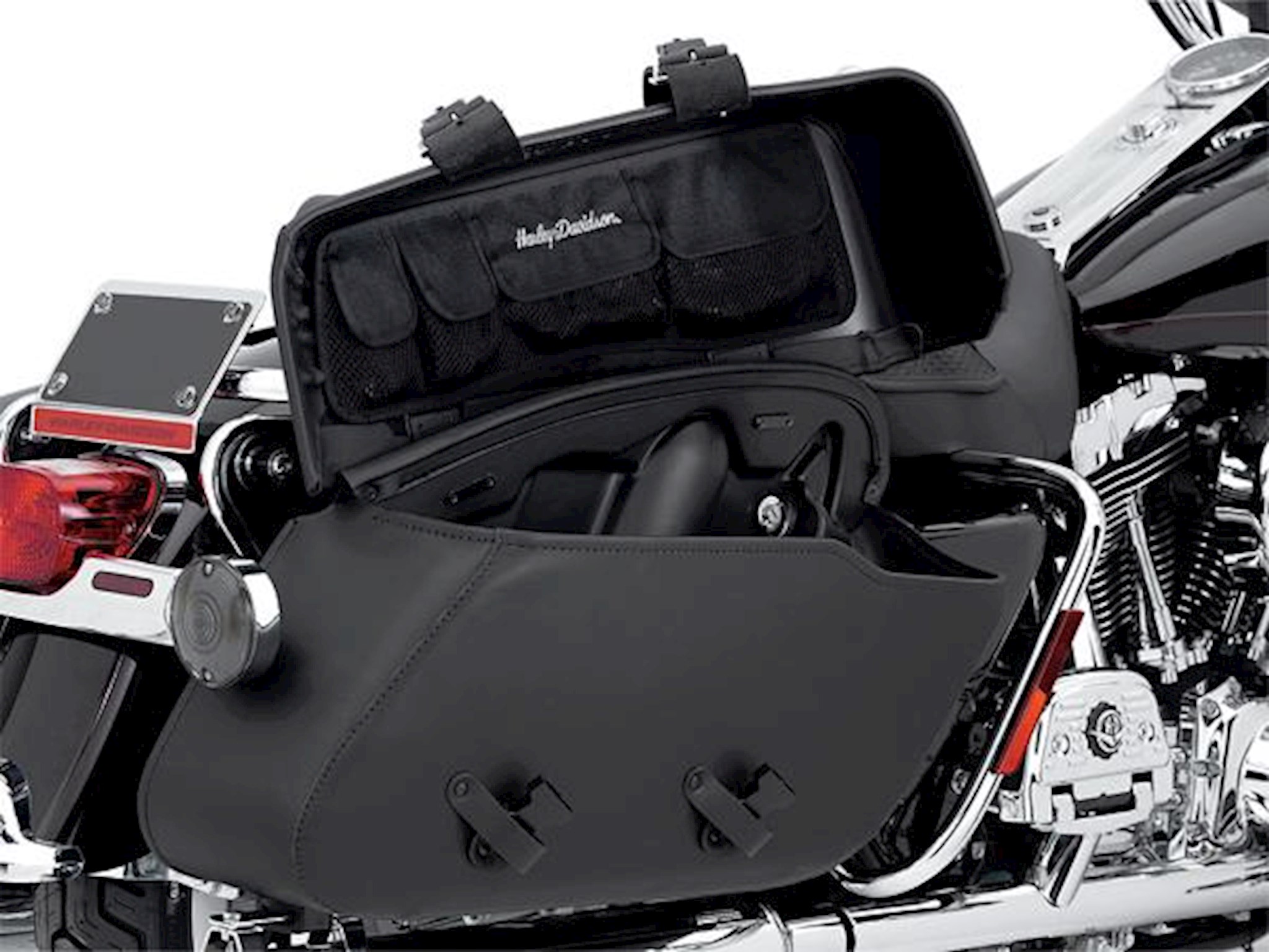 Convenient storage underneath the saddlebag lids with four easy access compartments for small items. Styled to match the Tour-Pak Lid Organizer, these easy-to-install accessories include an embroidered "Harley-Davidson" script. Sold in pairs.