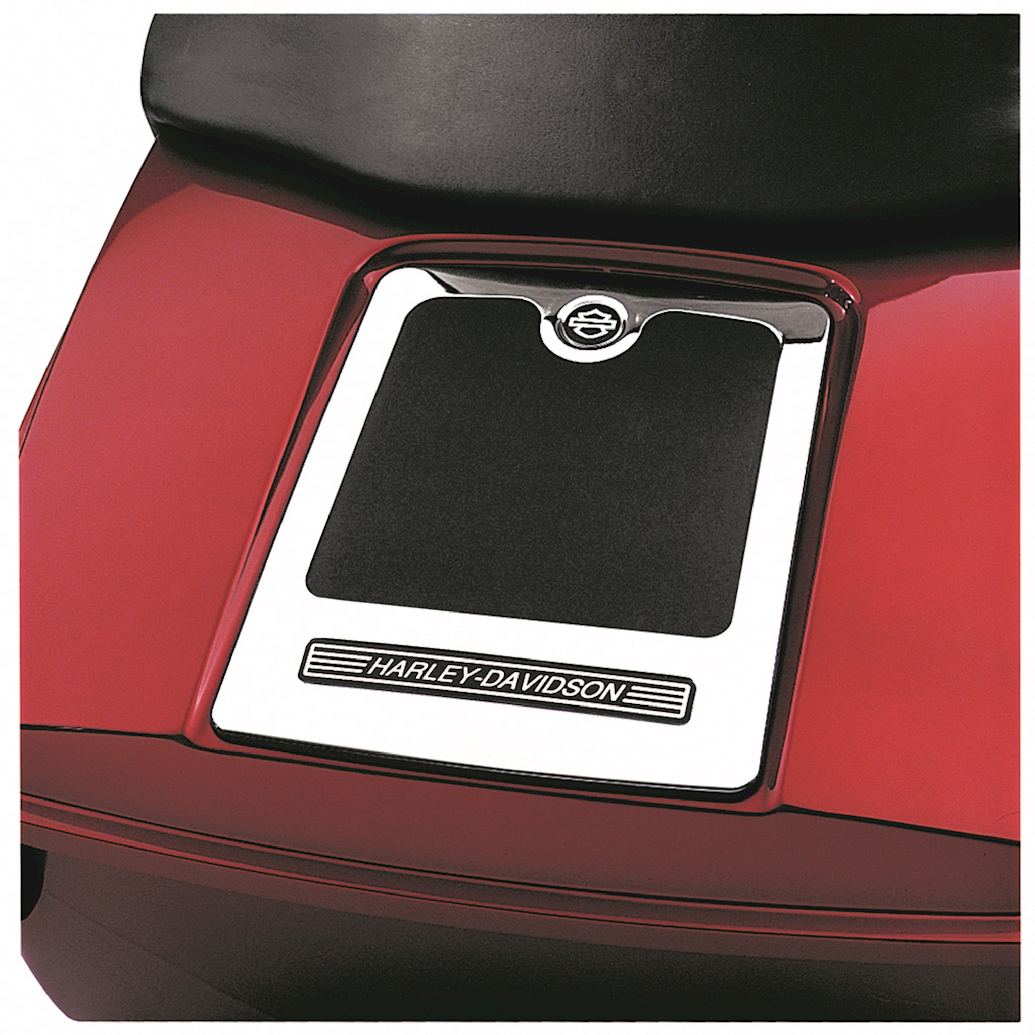 Chrome and leather are the classic materials to dress your Harley® motorcycle. And this Chrome and Simulated Leather Accent Panel is just the thing for customizing your Tour-Pak. The mirror-finish heavy chrome trim band with "Harley-Davidson" logo surrounds a field of black vinyl that fits the recess on your Tour-Pak lid. Includes installation hardware.