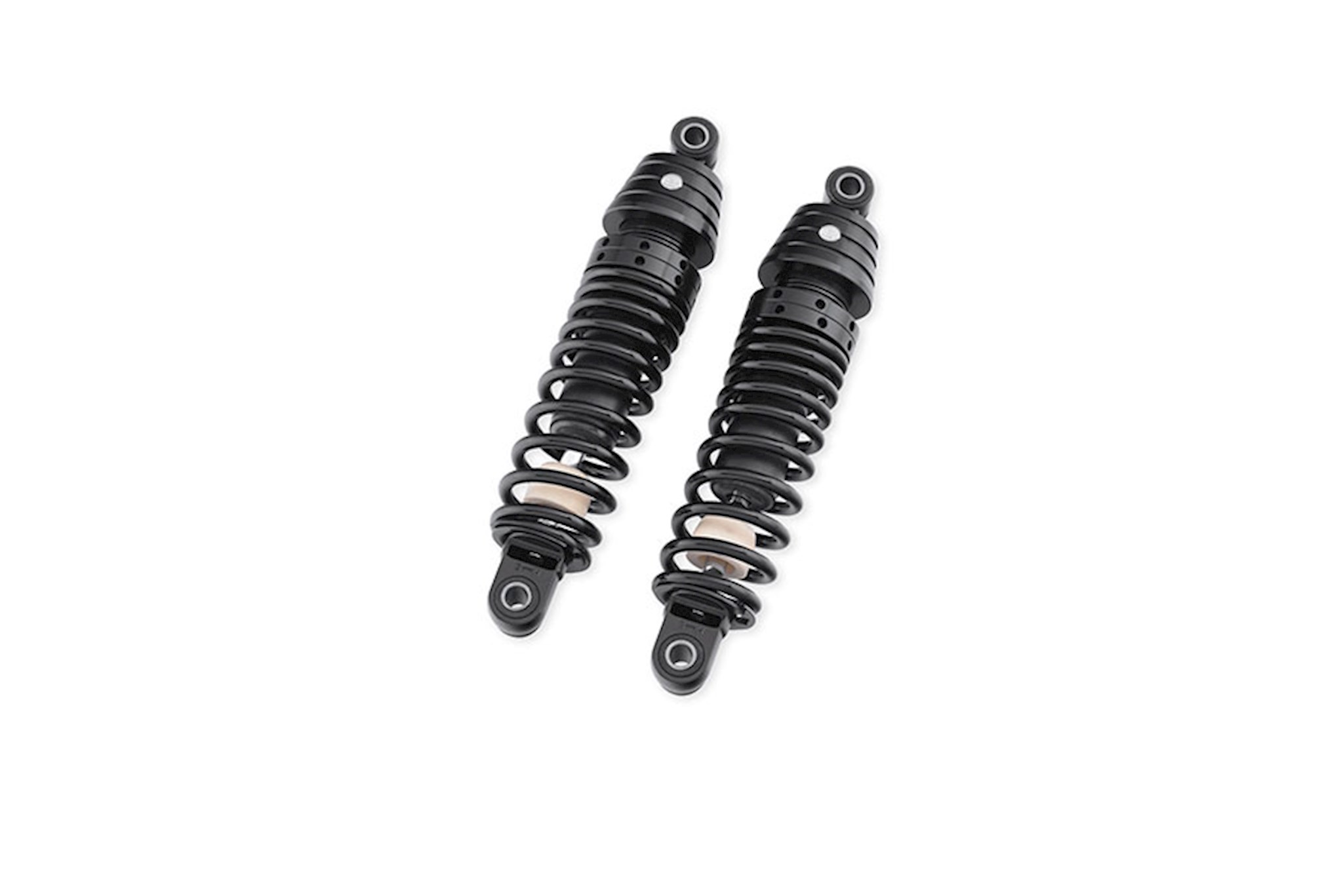 Experience a comfortable and confidence-inspiring ride - no matter the pavement conditions - with Harley-Davidson® Premium Ride Emulsion Shocks. These fast acting mono-tube nitrogen gas-charged shocks offer enhanced compression and rebound damping control when compared to typical twin-tube shock absorbers. The nitrogen gas charged shocks resist oil aeration and work with the internal valve stack to provide superior damping control in the twisties. The large 36mm pistons and low viscosity high-performance oil allow these shocks to react quickly to impacts and keep the tires tracking the road surface. You get a controlled ride and minimized bottoming harshness transmitted through the frame. The locking threaded adjustment lets you fine tune the spring preload to your current riding conditions - whether a solo run on the back roads or a fully-loaded two-up freeway tour - and urethane bumpers provide a softer feel if the shock bottoms under load. The beautifully-finished shocks feature black-anodized billet top caps and black progressively-wound springs. Kit includes left and right shock and preload adjustment spanner wrench.