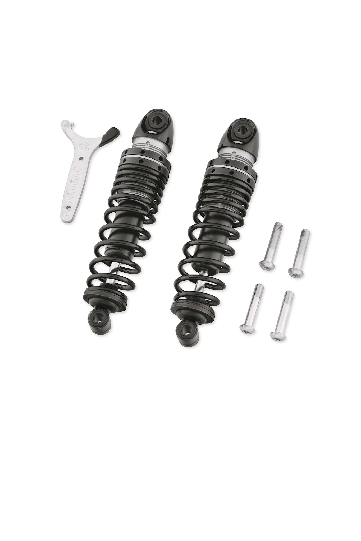 Experience a comfortable and confidence-inspiring ride - no matter the pavement conditions - with Harley-Davidson® Premium Ride Emulsion Shocks. These fast shocks offer enhanced compression and rebound damping control when compared to typical twin-tube shock absorbers. The nitrogen gas charged shocks resist oil aeration and work with the internal valve stack to provide superior damping control in the twisties. The large pistons and low viscosity high-performance oil allow these shocks to react quickly to impacts and keep the tires tracking the road surface. With the addition of urethane bumpers, you get a controlled ride and minimized bottoming harshness. The locking threaded adjustment lets you fine tune the spring preload to your current riding conditions - whether a solo run on the back roads or a fully-loaded two-up freeway tour. Kit includes left and right shock and preload adjustment spanner wrench.