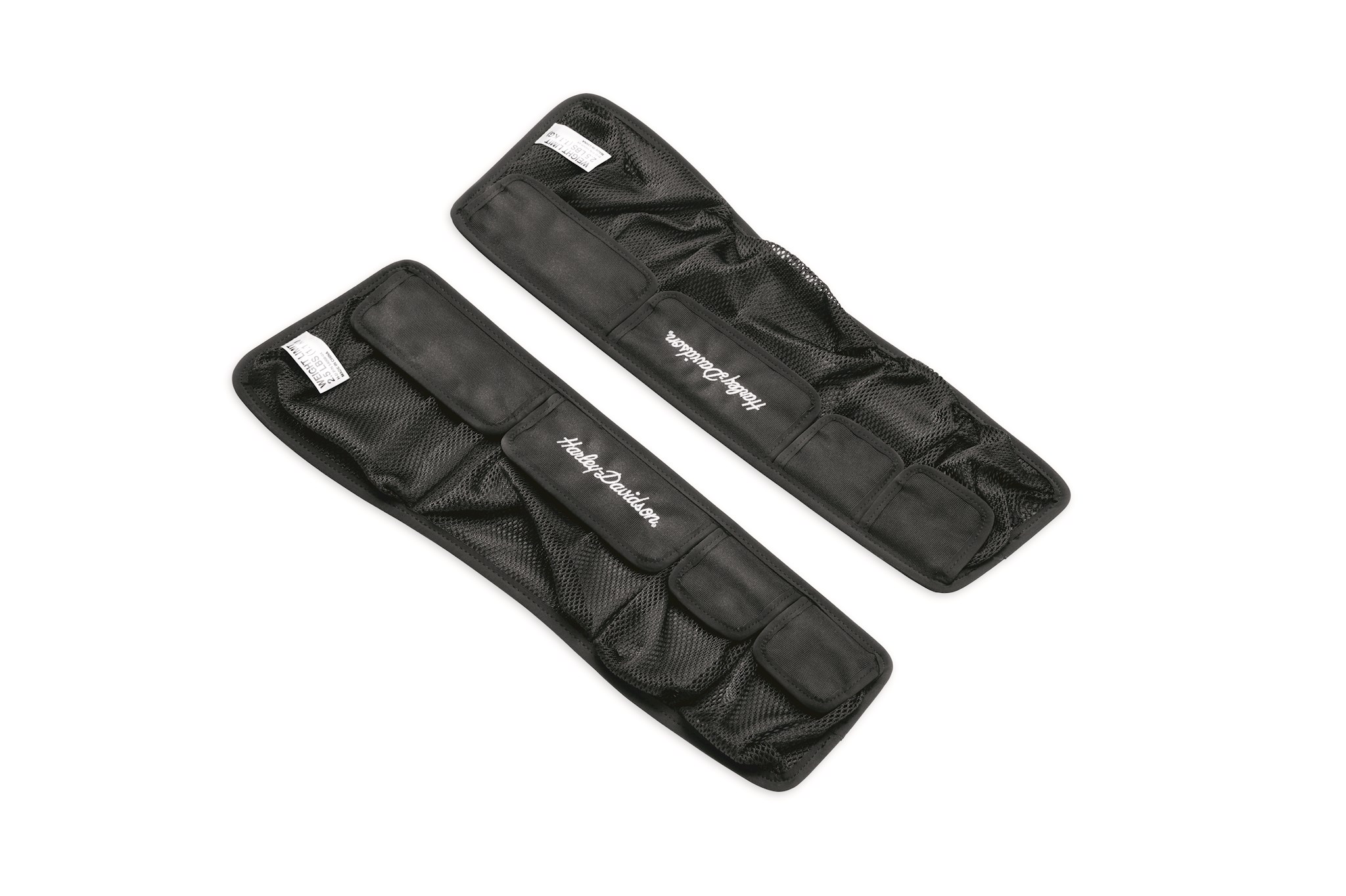 Convenient storage underneath the saddlebag lids with four easy access compartments for small items. Styled to match the Tour-Pak Lid Organizer, these easy-to-install accessories include an embroidered "Harley-Davidson" script. Sold in pairs.