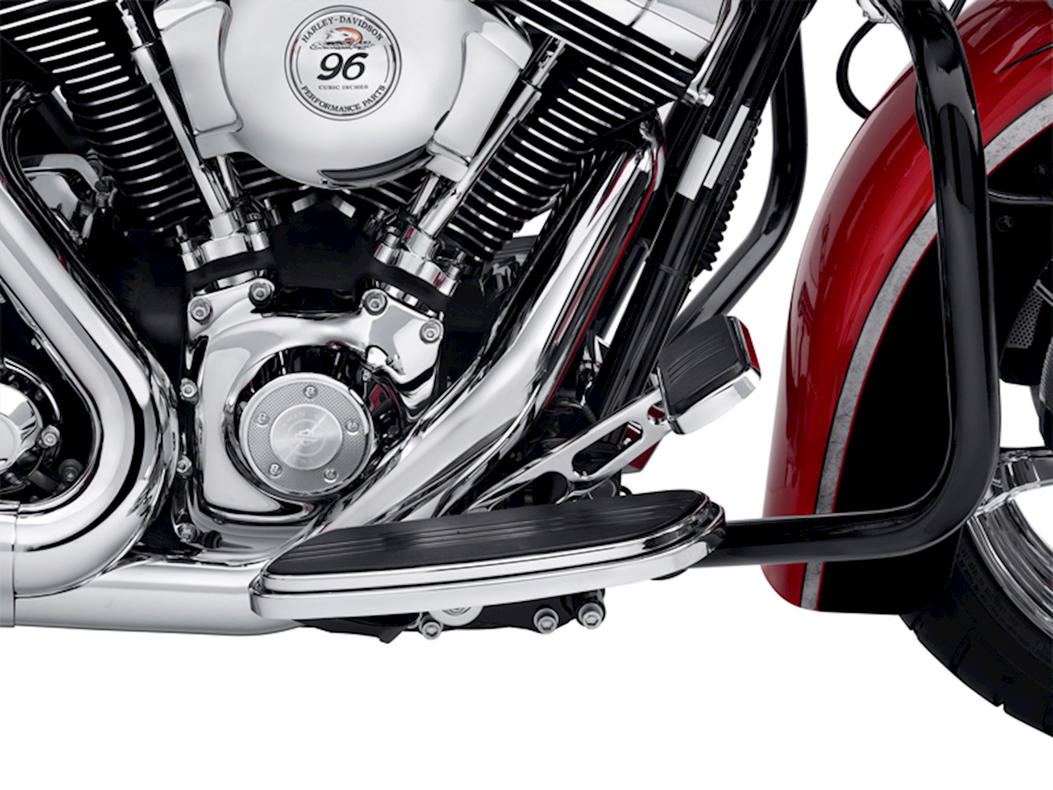 This kit extends the rider footboard forward of the stock location by one inch, providing the tall rider a comfortable riding position. When paired with Extended Reach Brake and Shift Levers, these pans allow riders with large boot sizes ample room to reposition their feet during a long ride. Available in traditional D-shape or Swept Wing design, Extended Reach footboard pans accept Original Equipment or accessory rider footboard inserts. The kit includes left and right footboard pans. Fits '02-later Touring and Trike models (except FLHTKL and FLHTCUL). Also fits '97-'01 Touring models equipped with Extended Reach Billet Style Brake Lever P/N 42638-03