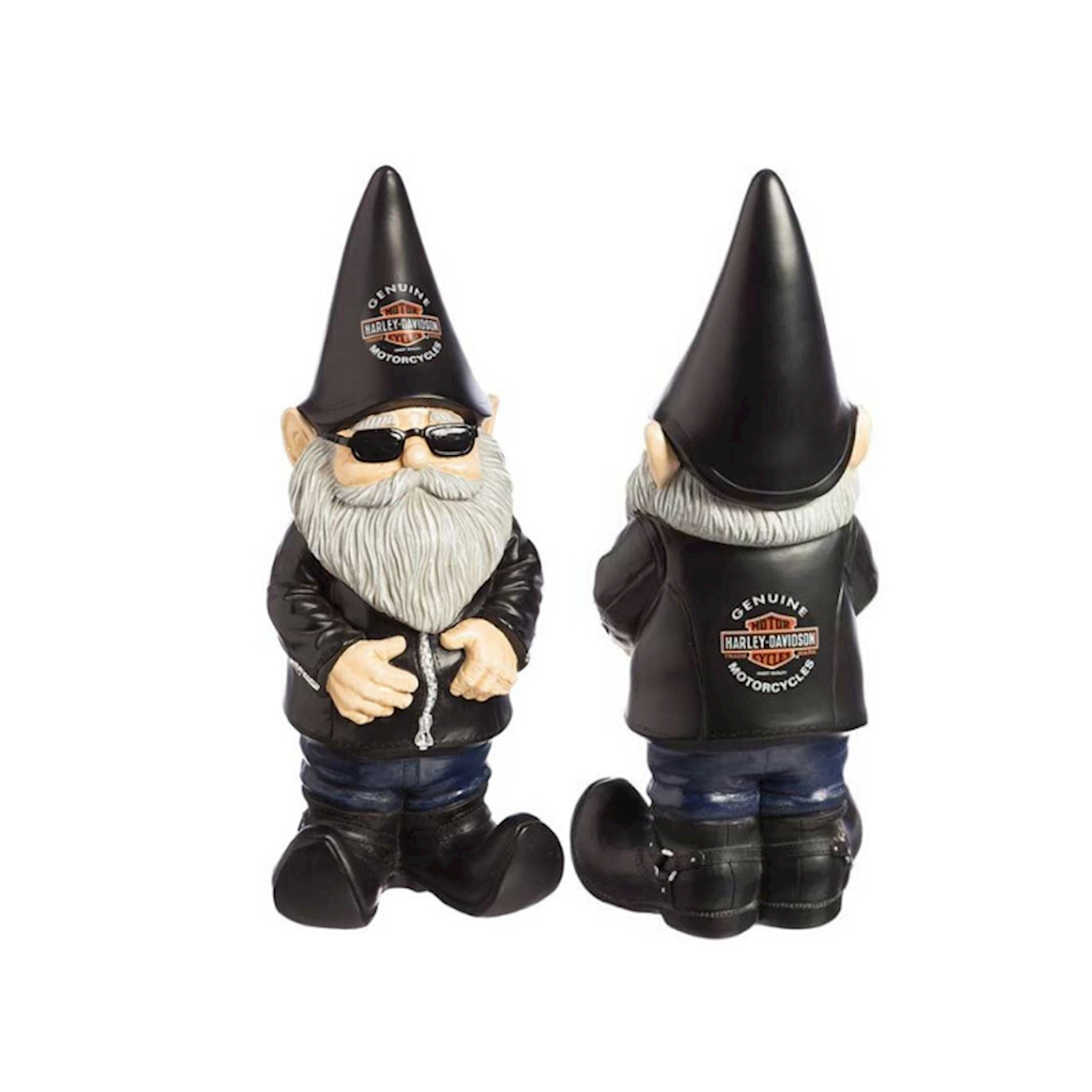 Made from painted polystone. Sculpted gnome decked out in Harley leathers. Size: 28 H. x 11 W. cm (4.5" W x 3.5" D x 11" H.) Garden Gnomes are believed to bring good luck to your garden. Black.