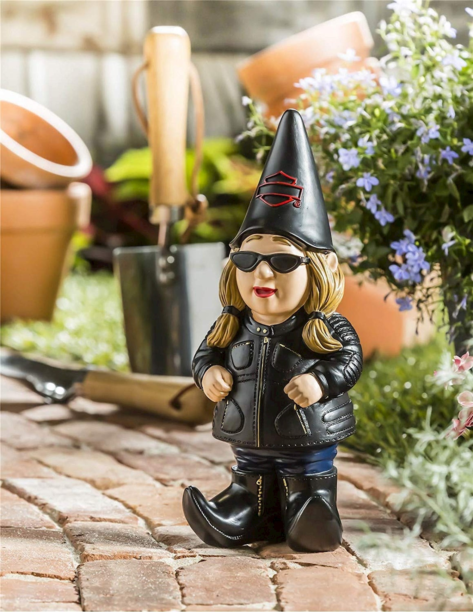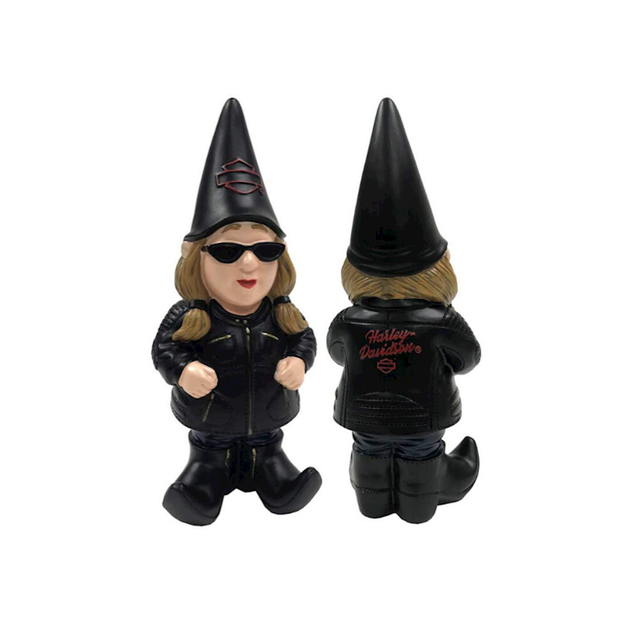 Made from painted polystone. Sculpted lady gnome decked out in Harley leathers. Size: 28 H. x 11 W. cm (4.5" W x 3.5" D x 11" H.) Garden Gnomes are believed to bring good luck to your garden. Black.