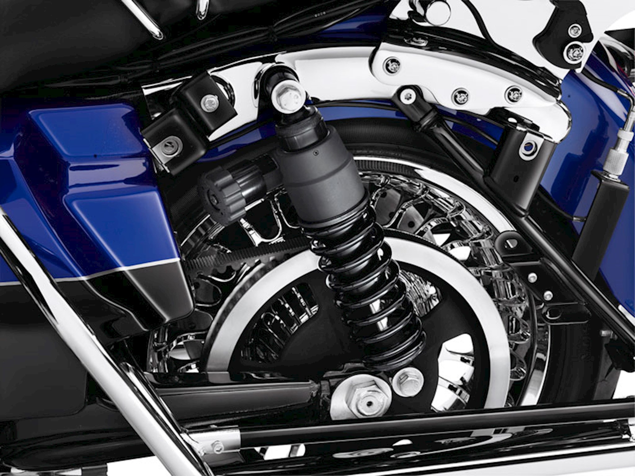 Experience the ultimate in superior ride quality with these Premium Touring Shocks. These shocks utilize a single tube, nitrogen charged emulsion design. The design offers enhanced compression and rebound damping compared to the Original Equipment-style air adjustable shocks. This provides a controlled yet plush ride with much less bottoming. The compression and rebound damping is split between the two shocks—compression on the right and rebound on the left. This design balances the load of each shock; stiff spring with rebound damping on the left and soft spring with compression damping on the right. Larger chambers (40mm diameter pistons and 14mm rods) allow these shocks to react more quickly to impacts. This keeps the tires tracking while minimizing harshness transmitted through the frame. A simple knob behind the left saddlebag allows the rider to conveniently modify the spring preload via a hydraulic adjuster. Available in Standard Ride Height and Low Ride Height versions.