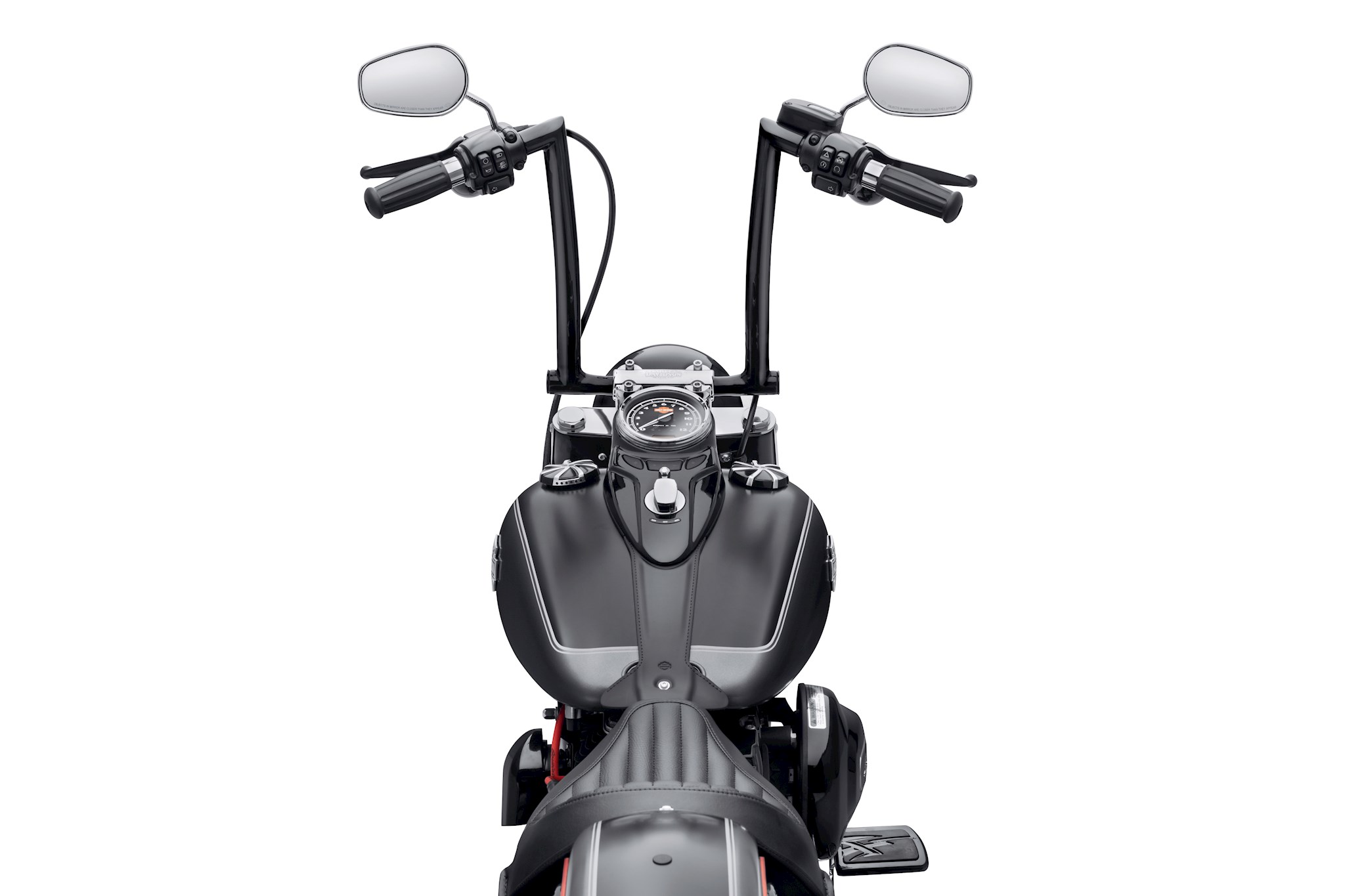 Achieve ultimate cutting edge style. The Chizeled Bar features the edgy profile of the classic "Z" bar and combines the hands-up feel of a mini-ape with the narrow width of a drag bar. The result? A classic chopper attitude. When installed with the stock riser, this 12" handlebar has the look and feel of a 14" version. The bar replaces mitered and welded corners with cast seamless 90° bends for added strength and style. The cast elbows eliminate sharp internal bends and the bar features removable Bar & Shield plugs to simplify internal wiring. The fat 1.25" bar necks down to fit stock 1.0" vehicle handlebar clamps. Fits '12-later FLD, '13-later FXDB and '00-later FLS, FLSS, FLSTC, FLSTF, FLSTFB, FLSTFBS, FLSTN, FXST, FXSTB and FXSTC models. Does not fit with Heated Hand Grips. All models require separate purchase of additional installation components.