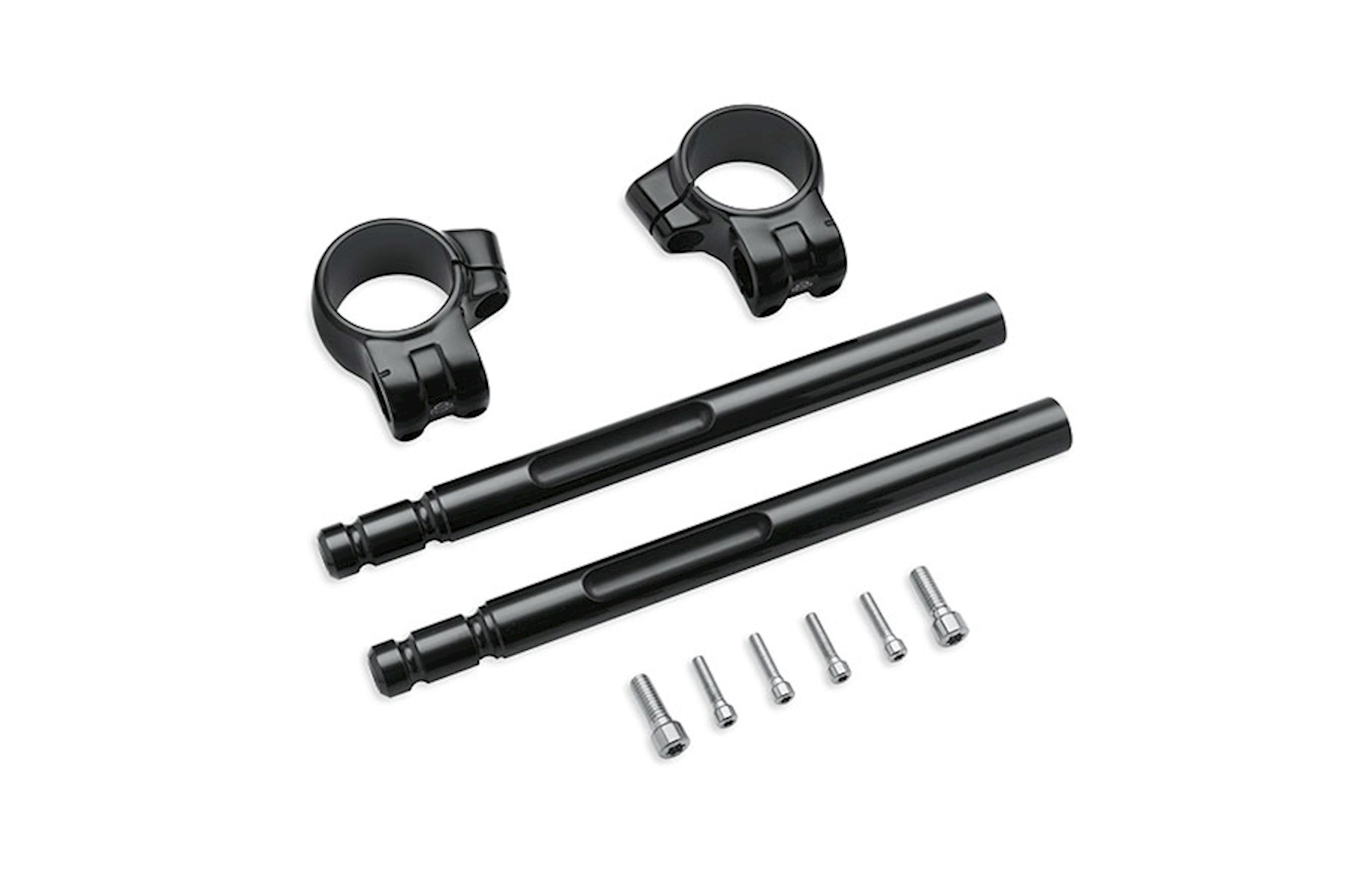 Mounted on the fork tubes below the upper triple tree, these Clip-On Handlebars place the rider in a low and aggressive tank-hugging riding posture. Ideal for carving corners and splitting lanes, these Clip-On bars narrow the overall width of the bike and keep the rider tightly tucked into the machine for a "one-with-the-bike" feeling. Fully adjustable for reach and height, these individual 12.25" bars are engineered from solid aluminum for strength, and drilled and dimpled to accept bar-end mirrors and standard hand controls. The beefy gloss black bars are secured to the fork tubes with precision-machined clamps and aircraft grade hardware. Kit includes bars, fork clamps and all mounting hardware. Individual vehicle applications may require separate purchase of instrument mount and cables or brake lines.