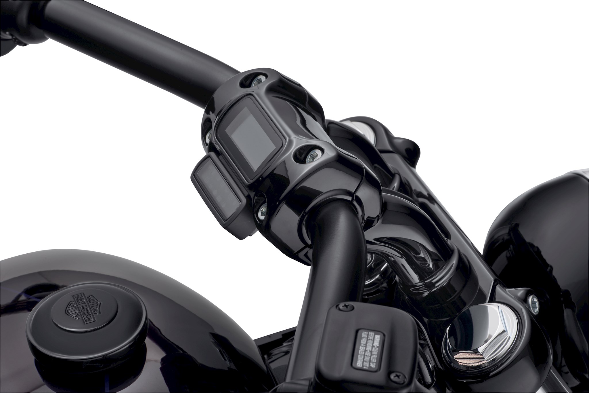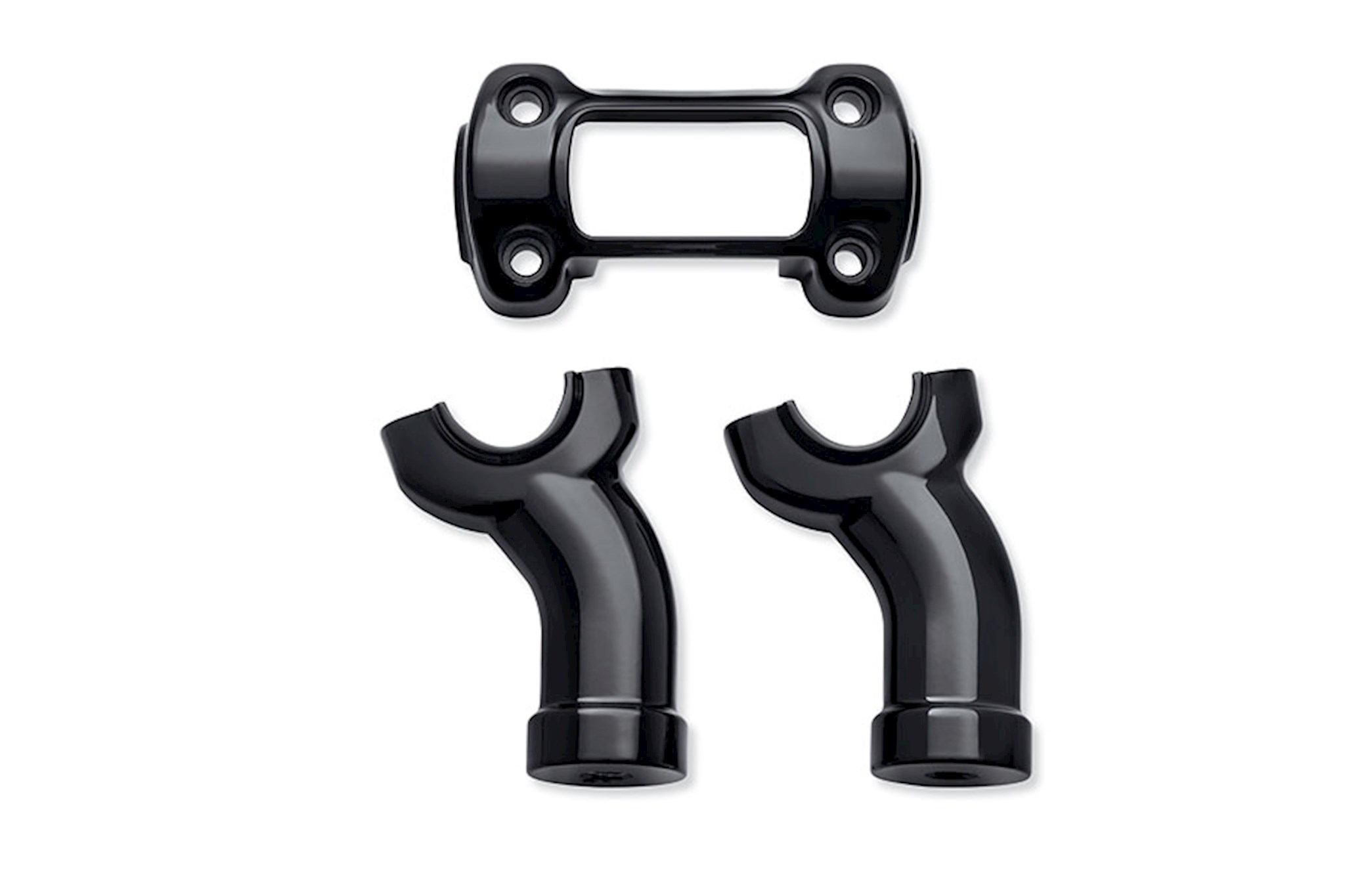 Required for installation of 1.25” handlebars on FXBB Street Bob models, this curved riser kit features a one-piece top clamp that is shaped to accept the Original Equipment clamp-mounted digital gauge package. Kit includes two curved risers and one-piece clamp.