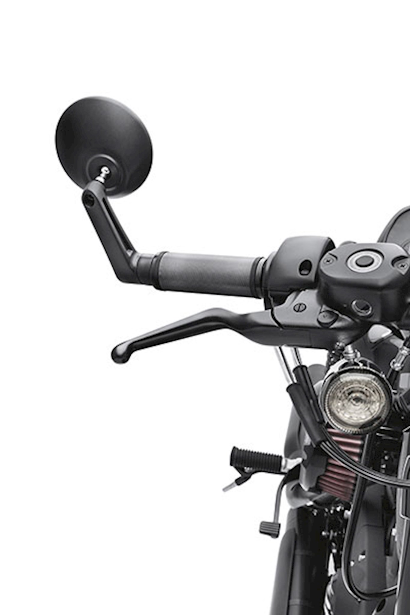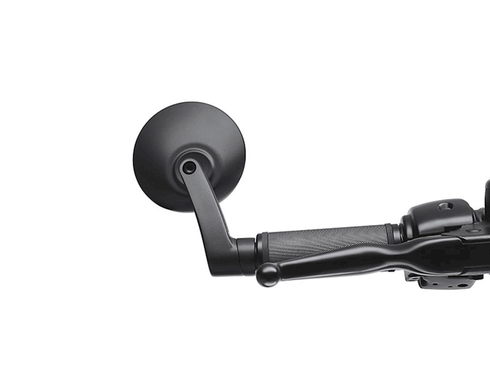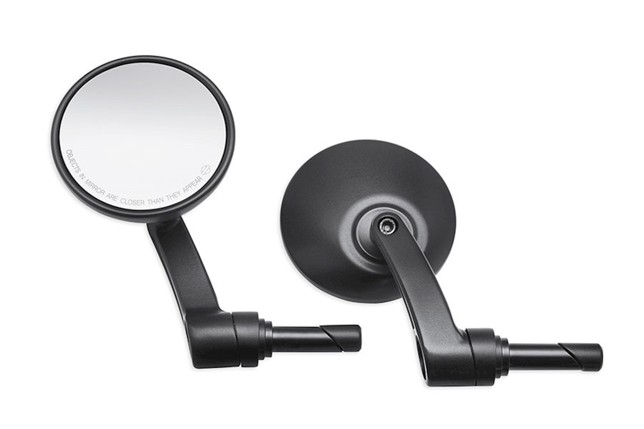 Complete the cut-down Café bike look. These Bar End Mirrors provide a clean, streamlined look when compared to traditional mirrors. These round convex mirrors plug into the end of the handlebar to extend beyond the hand grip for an improved field of view on the bike equipped with narrow bars. When equipped with the Bar End Mirror Hand Grips (sold separately), the mirrors are simply inserted into the end of the grip and tightened in place. The mirrors are adjustable for maximum rear visibility, and can be positioned above the bar or, in some configurations, below the bar. When positioned below the bar, the left hand mirror is used on the right, and the right had mirror moves to the left side. Includes hardware required to fit both 7/8" or 1" bars. Right and left mirrors are sold separately. Fits stock or accessory handlebars on '15-later XG (except models equipped with Drag Bar P/N 55800225 or 55800238), '02-'17 VRSCâ„¢ (except VRSCF), '96-later XL and XR, '96-'17 Dyna® (except FXDLS), '96-'15 Softail® (except FLSTNSE, FXSBSE and '11-'12 FLSTSE) and '96-'07 Touring models. Installation requires separate purchase of Diamond-Black Hand Grip P/N 56100199 (1") or 56100202 (7/8").