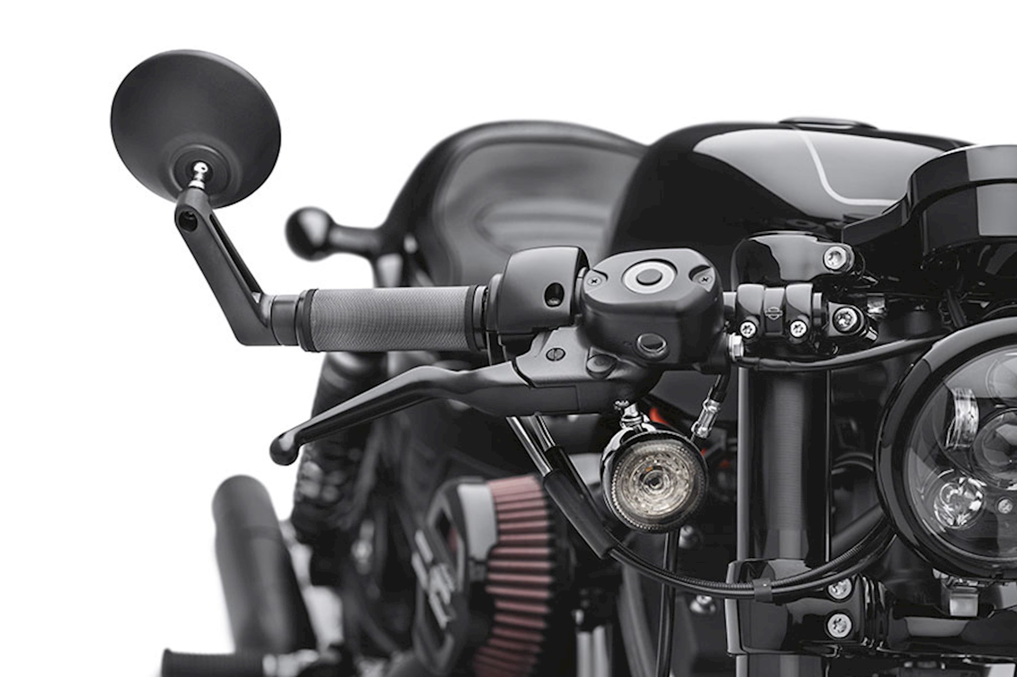 Complete the cut-down Café bike look. These Bar End Mirrors provide a clean, streamlined look when compared to traditional mirrors. These round convex mirrors plug into the end of the handlebar to extend beyond the hand grip for an improved field of view on the bike equipped with narrow bars. When equipped with the Bar End Mirror Hand Grips (sold separately), the mirrors are simply inserted into the end of the grip and tightened in place. The mirrors are adjustable for maximum rear visibility, and can be positioned above the bar or, in some configurations, below the bar. When positioned below the bar, the left hand mirror is used on the right, and the right had mirror moves to the left side. Includes hardware required to fit both 7/8" or 1" bars. Right and left mirrors are sold separately. Fits stock or accessory handlebars on '15-later XG (except models equipped with Drag Bar P/N 55800225 or 55800238), '02-'17 VRSCâ„¢ (except VRSCF), '96-later XL and XR, '96-'17 Dyna® (except FXDLS), '96-'15 Softail® (except FLSTNSE, FXSBSE and '11-'12 FLSTSE) and '96-'07 Touring models. Installation requires separate purchase of Diamond-Black Hand Grip P/N 56100199 (1") or 56100202 (7/8").