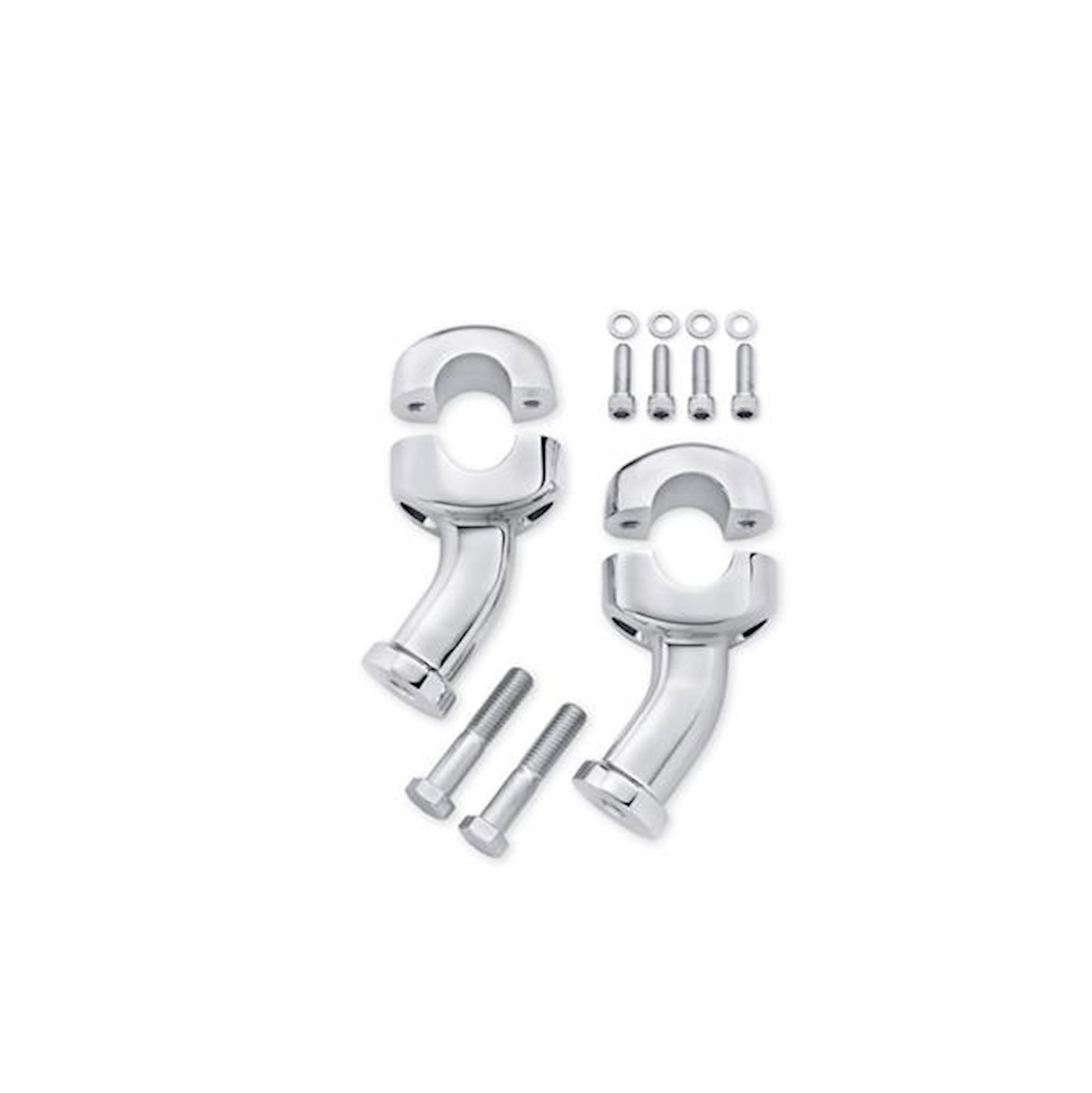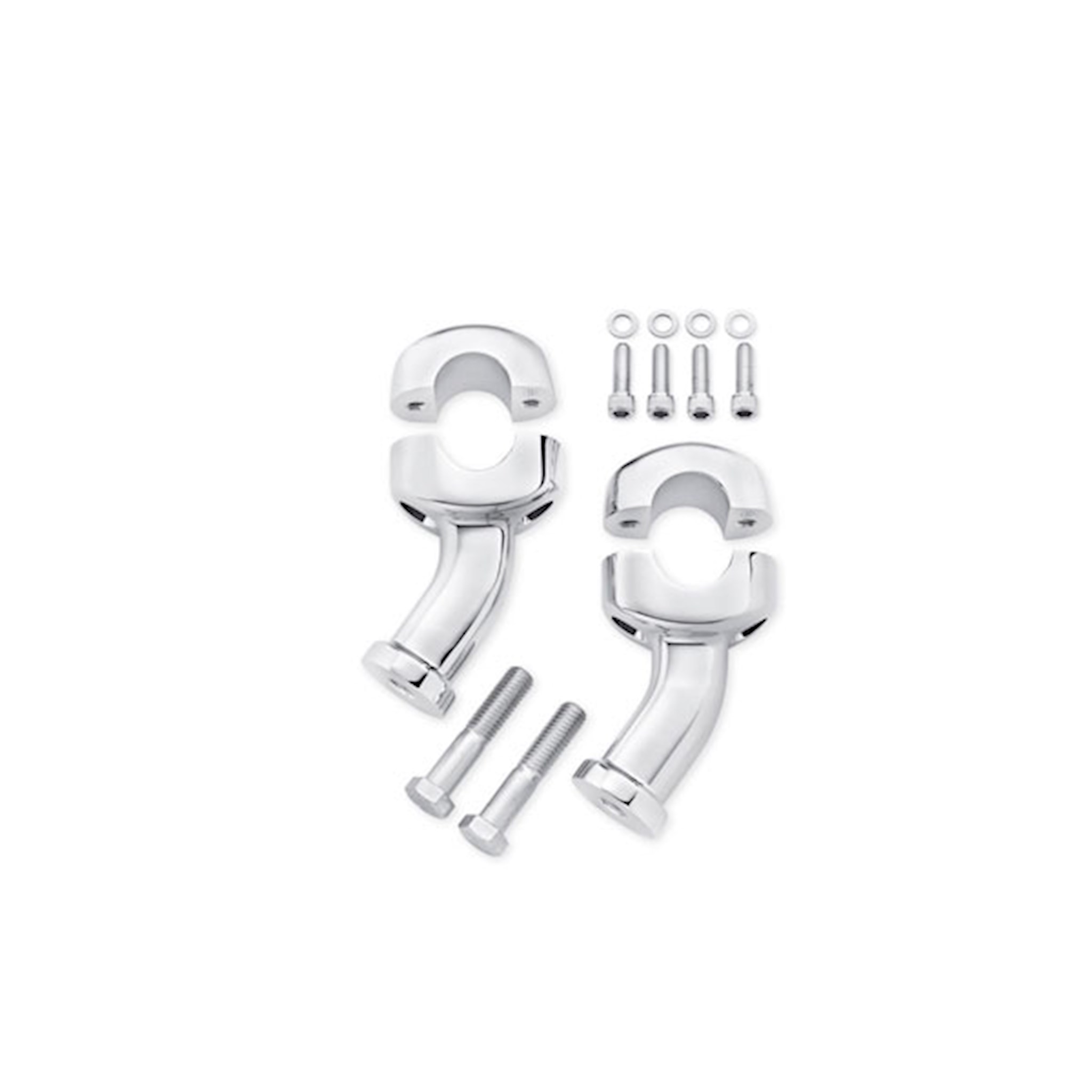 These chrome-plated Curved Pull Back Risers provide a comfortable riding position for those who like the shape, width and hand position of their current handlebar, but wish it was closer. For an ergonomically-friendly ride, these risers can be combined with a Harley-Davidson® Reduced Reach® Seat and Profile® Low suspension components to reduce arm stretch and to plant the feet firmly on the ground. Fits most 1.25" diameter handlebars. Does not fit FXSB, FXSBSE and Springer models. Requires separate purchase of additional components.