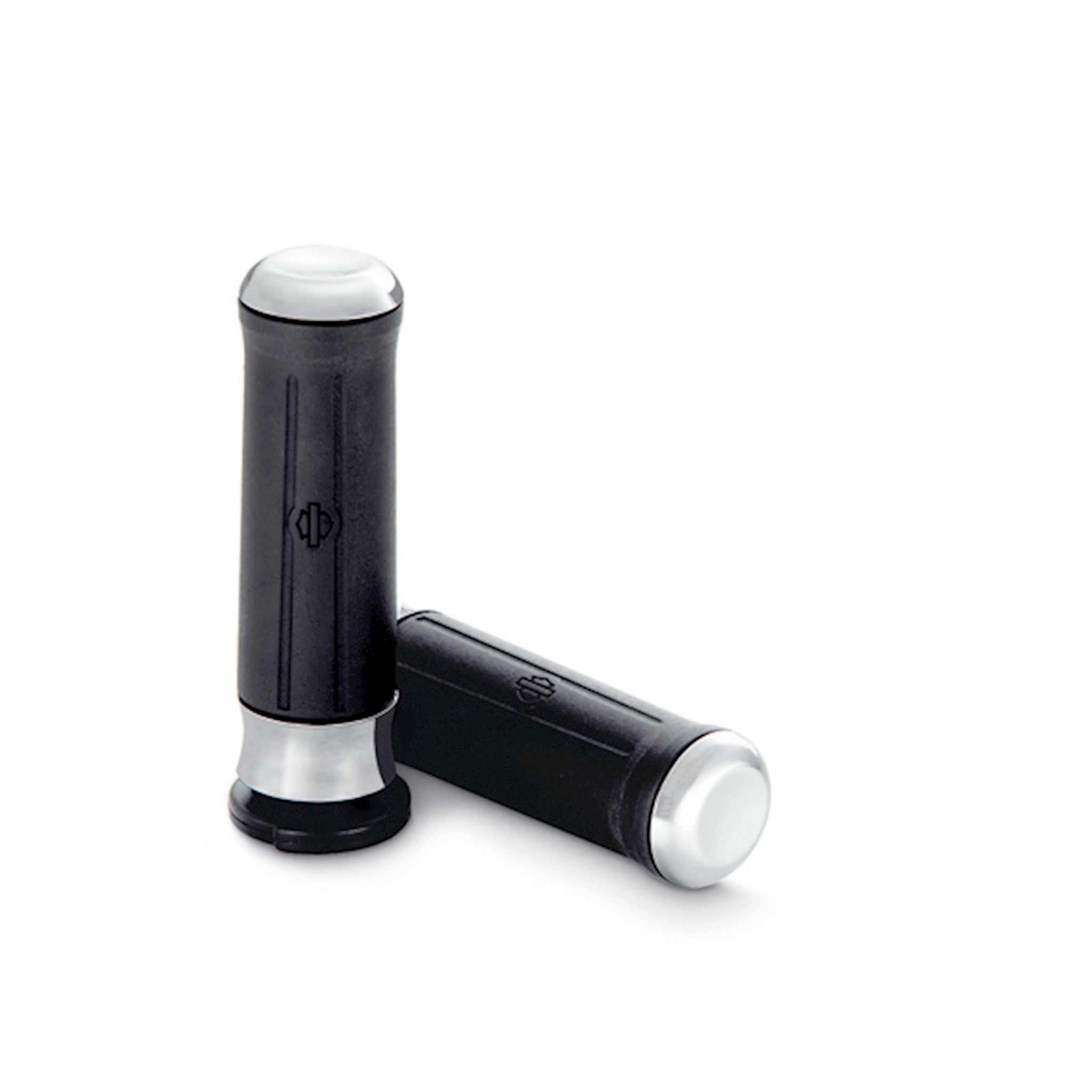 These grips combine a classic hourglass shape for comfort with the style for the new century. The black molded rubber surface with Bar & Shield logo gives plenty of grip, while the chrome end caps add a smooth organic touch. Fits '96-later VRSCâ„¢, XL, XR, Dyna®, Softail® (except FLSTSE2/3, FLSTNSE and FXSBSE) and '96-'07 Touring models.