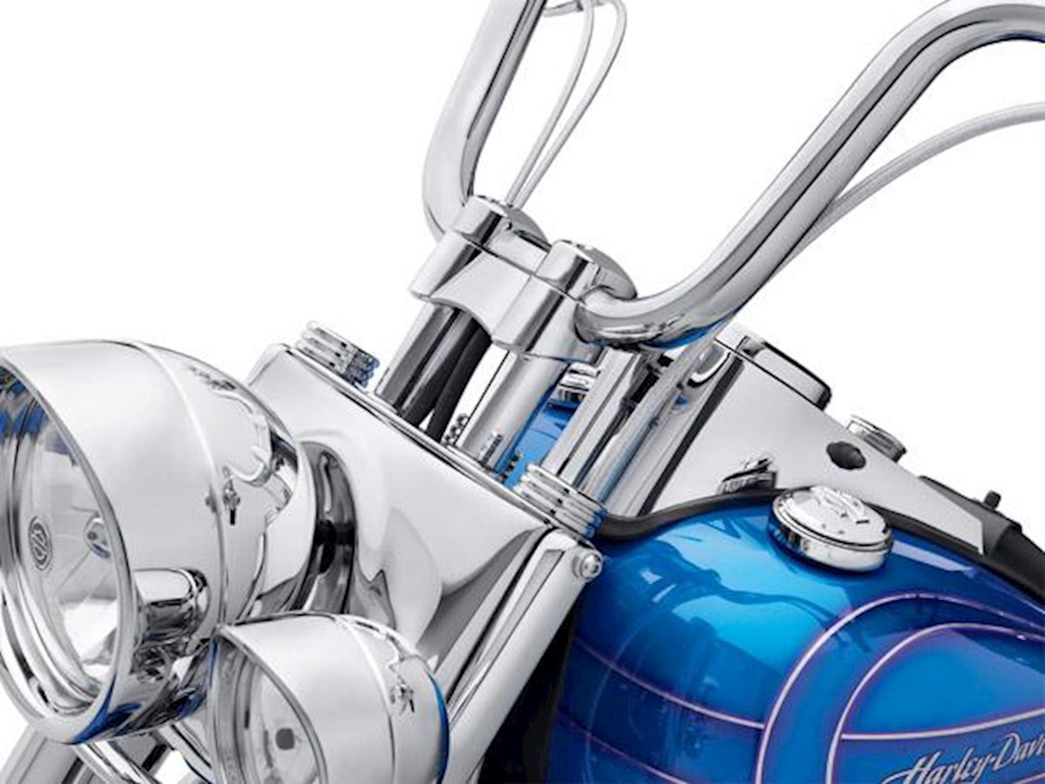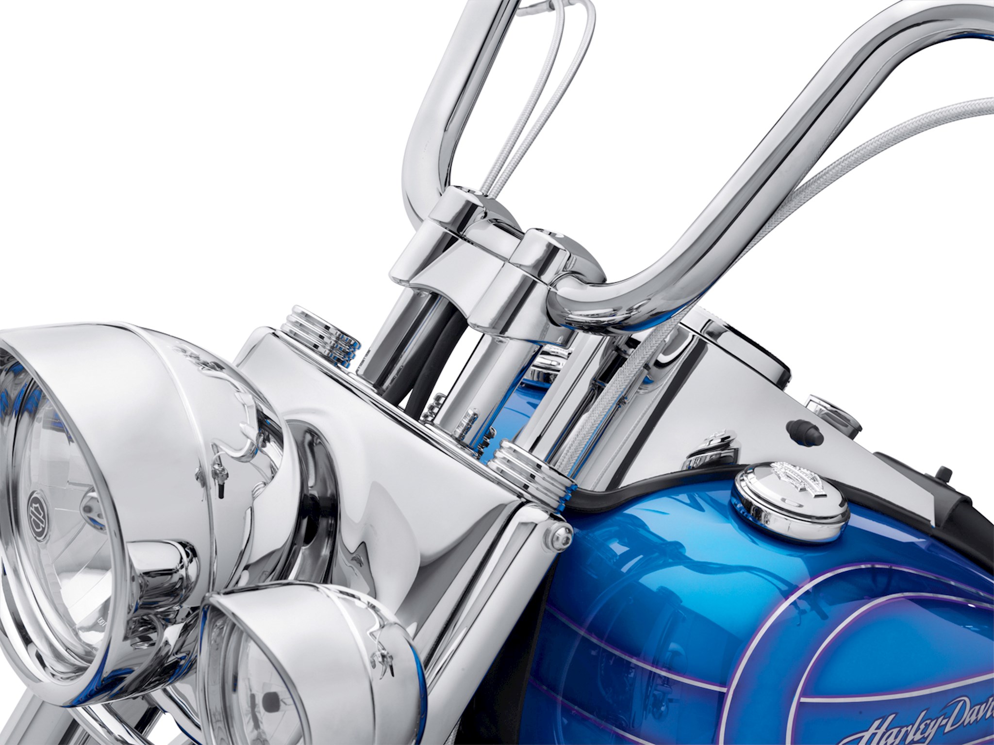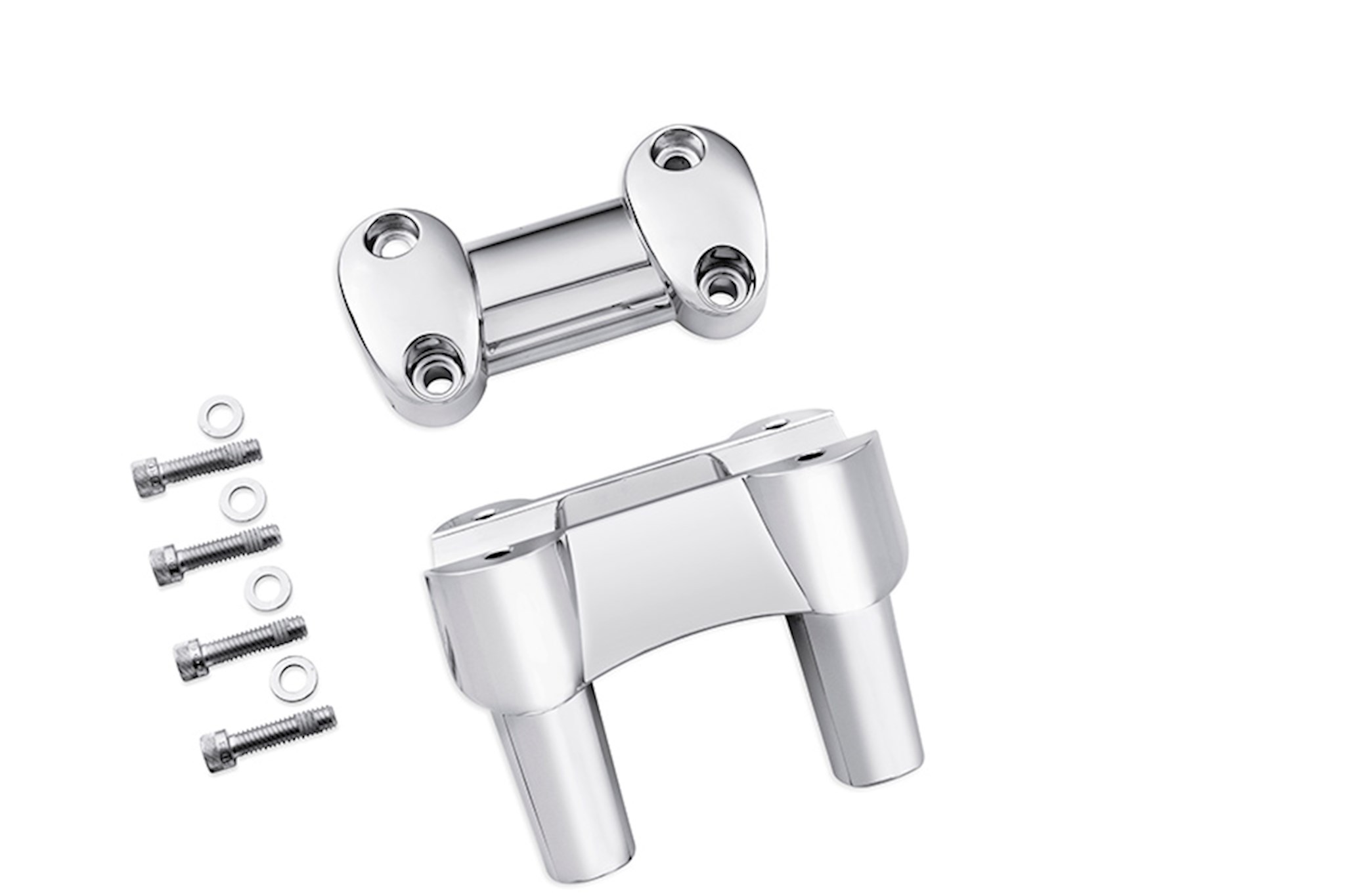 This riser features a one-piece base that is designed for use with internally-wired 1.25" handlebars and provides a skirt that conceals the wiring's exit from the bar. The matching handlebar clamp ties it all together. Available in mirror-chrome or gloss black finish, the kit includes riser, matching handlebar clamp and clamp hardware. Fits most 1.25" diameter handlebars. Does not fit FXSB, FXSBSE and Springerâ„¢ models. Requires separate purchase of additional components. Riser height 4.1".