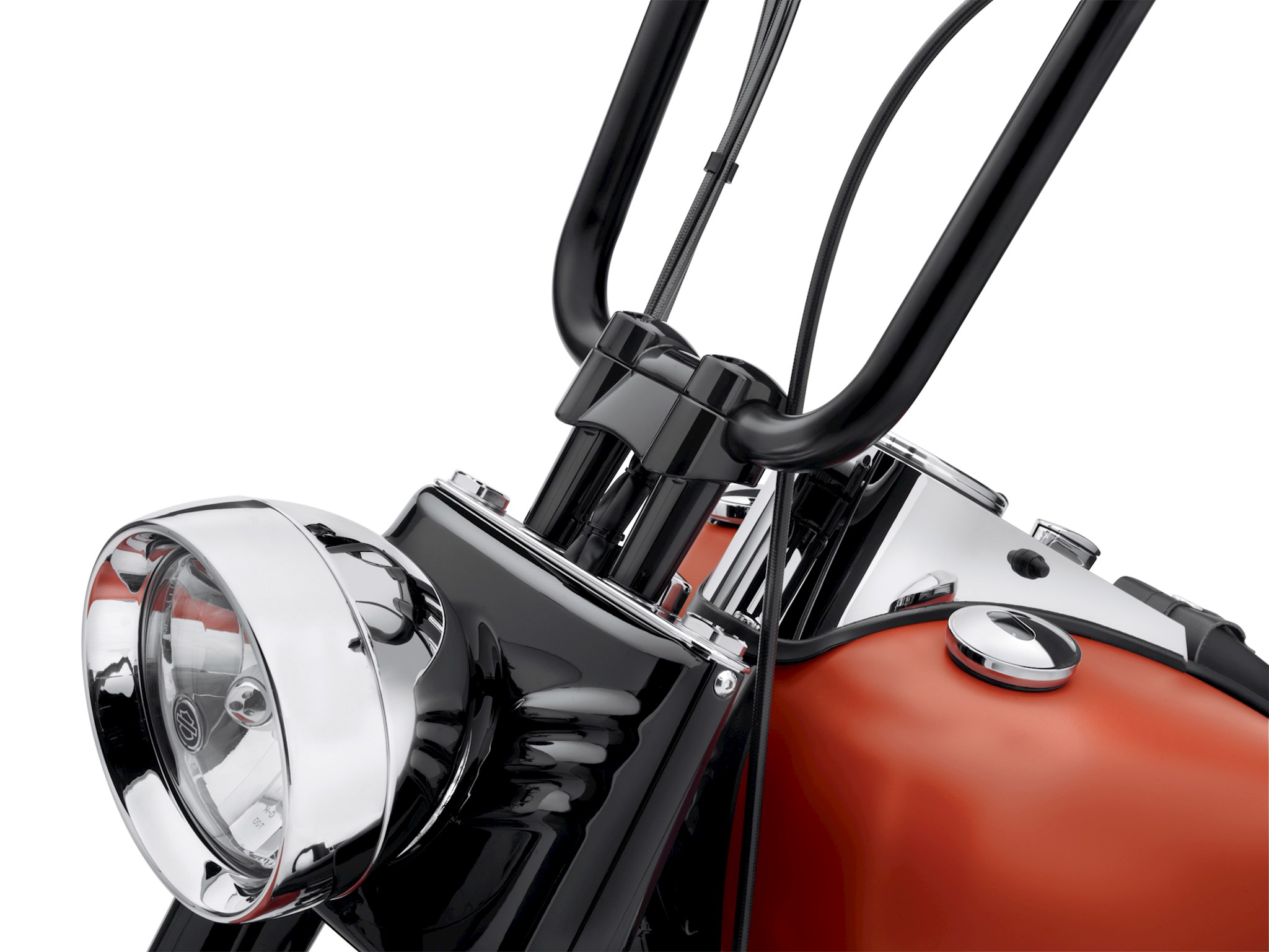 This riser features a one-piece base that is designed for use with internally-wired 1.25" handlebars and provides a skirt that conceals the wiring's exit from the bar. The matching handlebar clamp ties it all together. Available in mirror-chrome or gloss black finish, the kit includes riser, matching handlebar clamp and clamp hardware. Fits most 1.25" diameter handlebars. Does not fit FXSB, FXSBSE and Springerâ„¢ models. Requires separate purchase of additional components. Riser height 4.1".