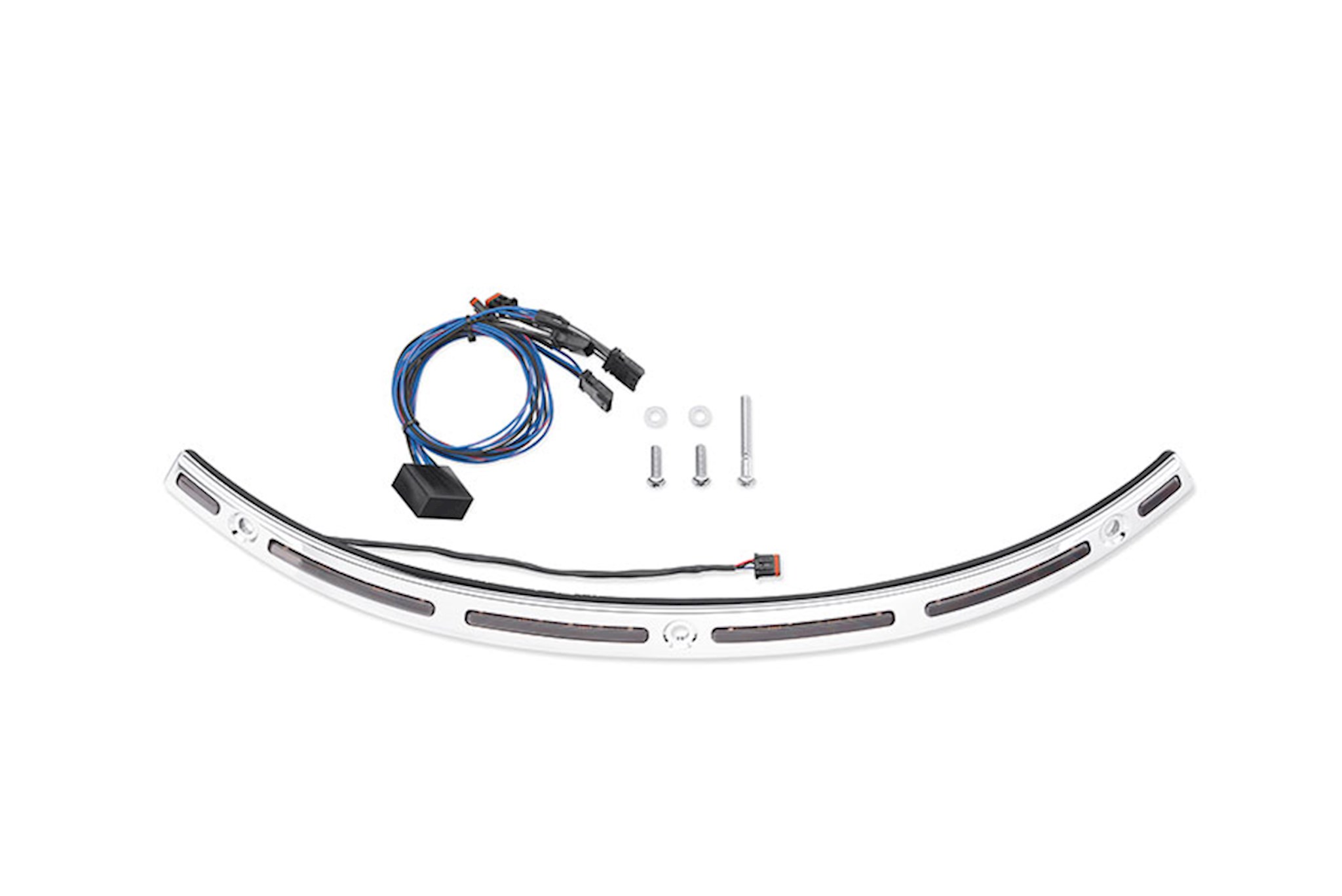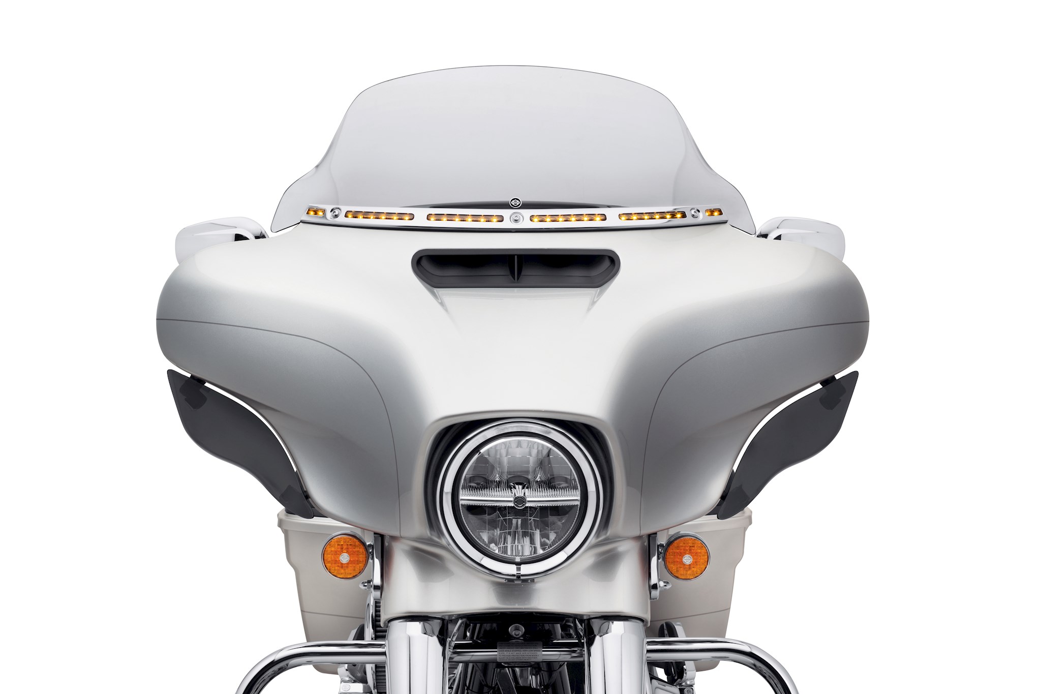 Smoked lenses hide bands of amber LED lamps that glow as running lamps when the ignition is on, and the two outer clusters function as auxiliary directional indicators when the turn signals are activated. The wiring is concealed inside the fairing for a clean, custom appearance. Complete kit includes all necessary mounting hardware. Fits '14-later Electra Glide, Street Glide, Ultra Limited and Tri Glide models. Installation on CVO™ models requires removal of current windshield trim. Not for use with Three-Pocket Fairing Pouch P/N 93300054A.