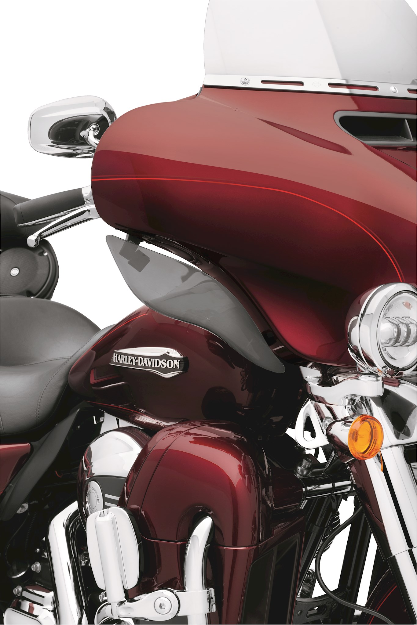 The Adjustable Air Deflectors feature an infinitely adjustable friction pivot that holds the wing in position to direct the air where you need it. Close the vent to direct airflow around the fairing or open the vent to maximize airflow on hot days. Available in dark or light smoke finish, the translucent deflectors are easy to install with the included mounting hardware. Fits '14-later Street Glide® models. Original Equipment on Electra Glide® and Tri Glide® models.