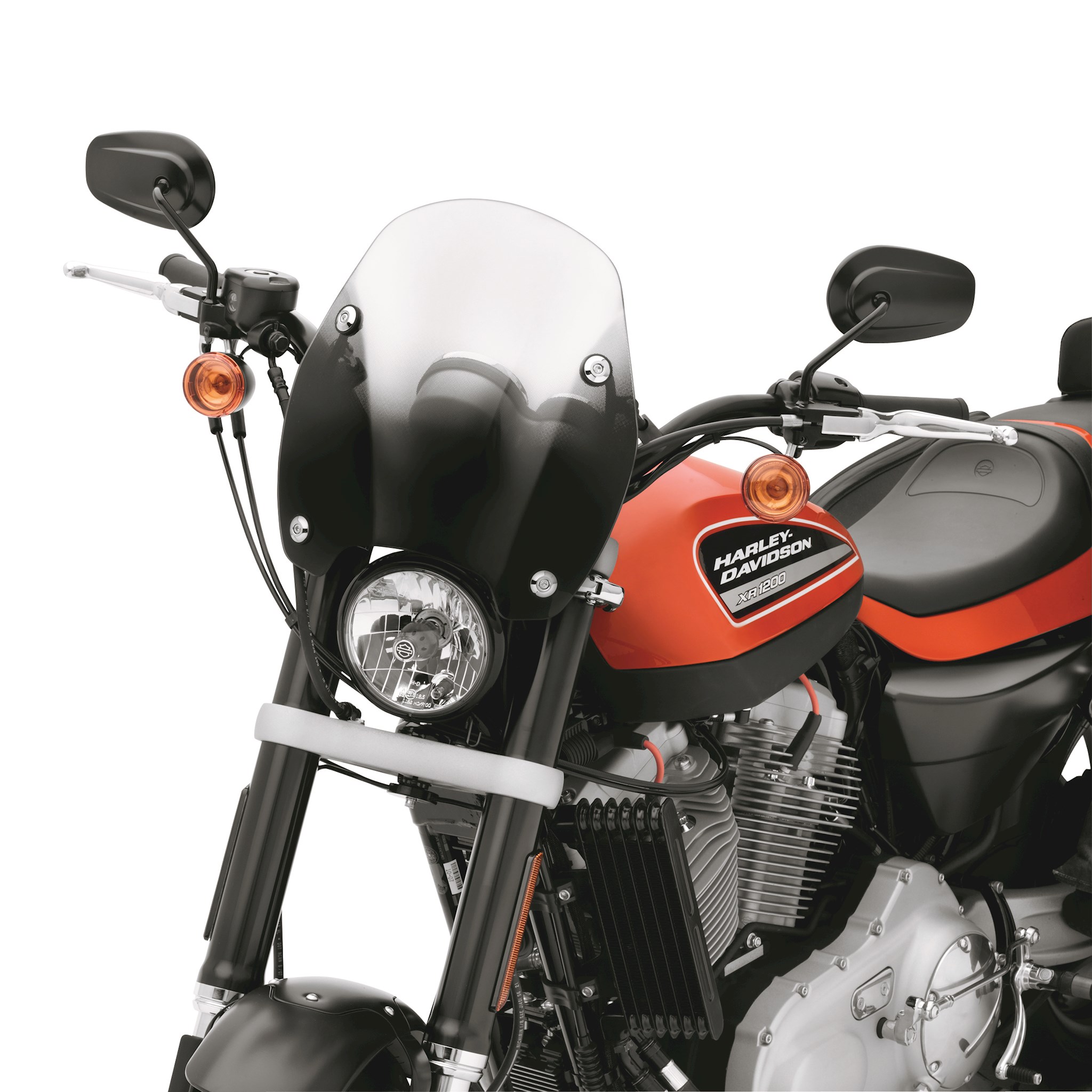 Reduces the pounding of wind and shower of bugs but keeps the wind-in-the-hair feeling. Ideal for a cool morning ride, the sleek profile of the Super Sport Windshield hugs the front headlamp for a sporty look. The windshield mounts to the fork tubes with elegant die-cast lever locking clamps, so the windshield does not require any "leave-behind" docking hardware. You get quick on-and-off convenience and a clean, custom look. No tools are required and the kit includes everything needed to install the windshield. Fits '08-'13 XR1200™ models.