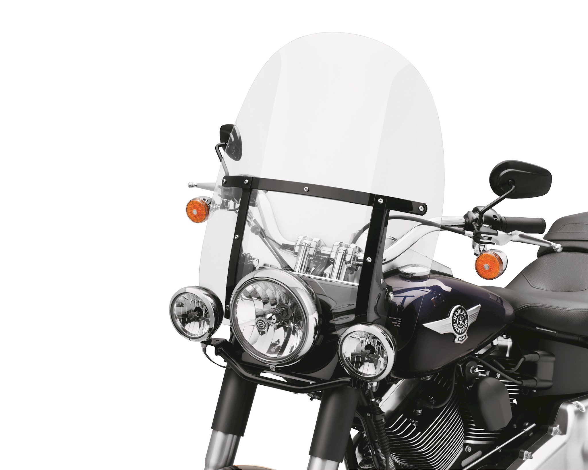 Designed to be installed or removed without tools in seconds, a detachable windshield gives you the freedom to define your ride at the drop of a hat. Ride across the country protected from the elements, then quickly remove the windshield to hit the streets in style. This one-piece windshield is formed from hard-coated polycarbonate material to resist scratching. The shield is attached to stainless steel mounting brackets supported by molded-rubber bushings for improved isolation. Windshields are available with contemporary gloss black braces and mounting brackets and in a variety of heights to match your size and riding style. Fits '00-later FLS, FLST, FLSTC, FLSTF, FLSTFB and FLSTN models equipped with auxiliary lighting. Does not fit with Custom Auxiliary Lighting Kit P/N 68000051. Includes mounting hardware.