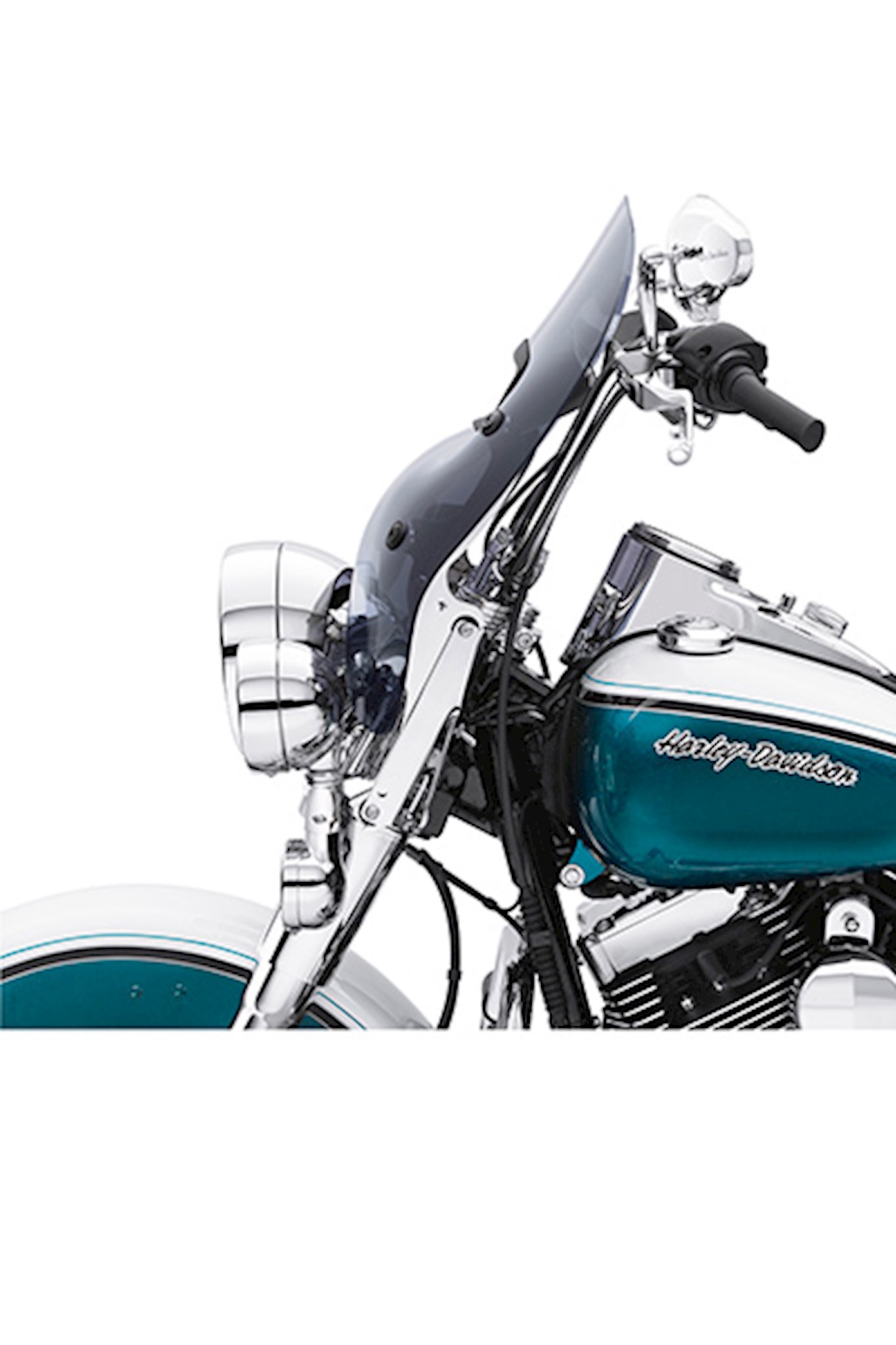 Reduce helmet buffeting at speed. The Harley-Davidson® Detachables™ Wind Splitter Vented Windshield features an exclusive fingertip-adjustable center vent that reduces turbulence behind the windscreen. When open, the controlled airflow fills the negative pressure area behind the shield and helps to smooth the flow of air over the top of the screen and around the rider. The revised flow reduces helmet bobbing and neck fatigue so you can comfortably spend more time in the saddle. The open vent also provides cooling airflow to the rider at low speeds and in city traffic. Engineered to provide the riding comfort of a larger windshield, this low-profile screen's contemporary contour sets it apart from the crowd. The shape keeps the windshield below your siteline so you don't look through bugs and road grime and the detachable design means you can ride without the shield when the mood strikes. The shield is formed of hard-coated polycarbonate for strength and scratch resistance and the dark-smoked finish reduces glare. The slim polished stainless steel brackets mount to the Original Equipment rubber isolated docking points for ease of installation and removal.