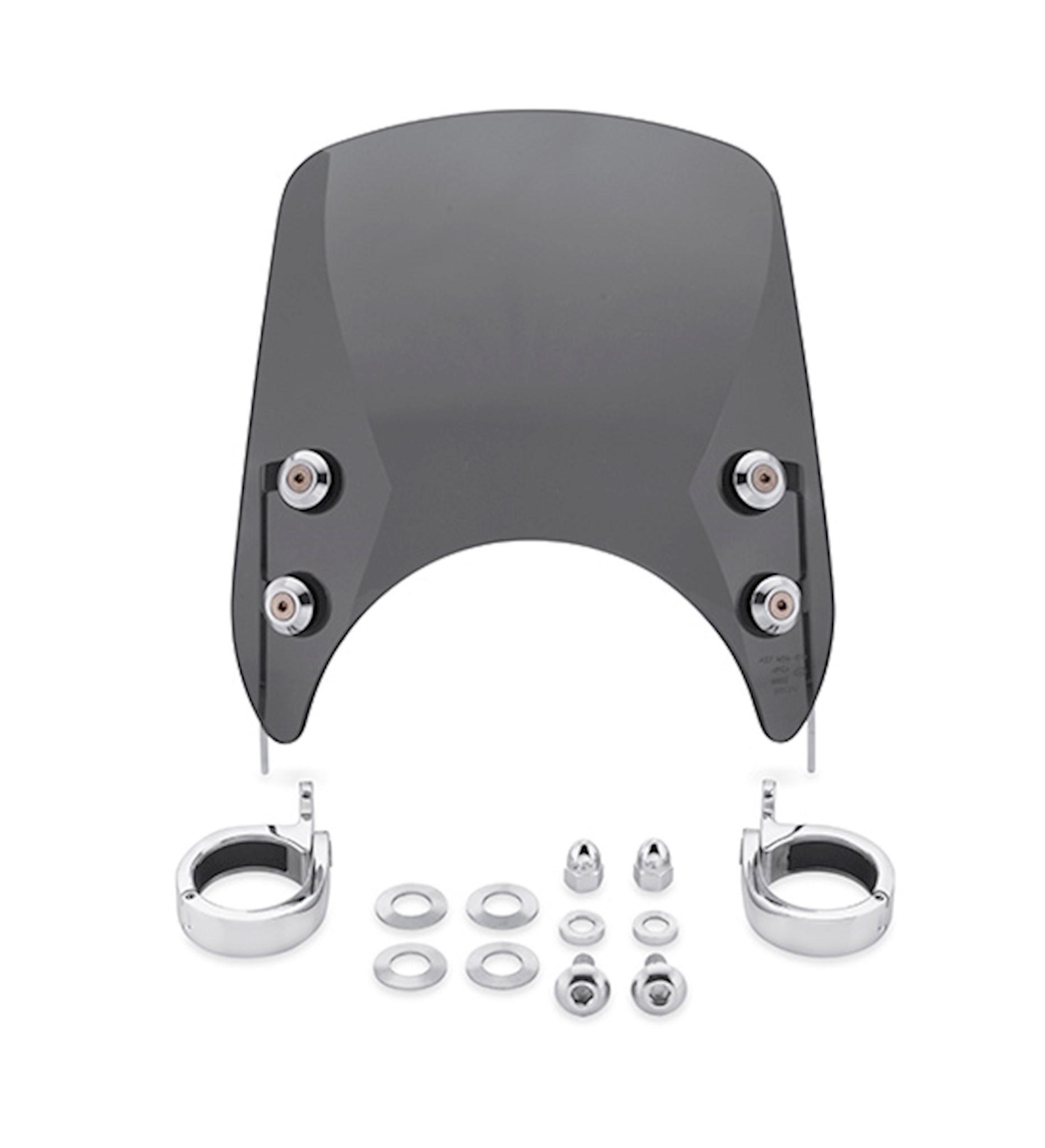 Shaped to smooth the wind flow around the headlamp and handlebar mount gauges, this compact bikini screen is the ideal addition to your ride. Sitting just above the headlamp, the Compact Wind Deflector maintains the stripped-down minimalist attitude of the Sportster motorcycle while adding a clean, custom look. The easy-to-install dark polycarbonate screen attaches to the fork tubes with chrome-plated adjustable clamps. Kit includes all mounting hardware.