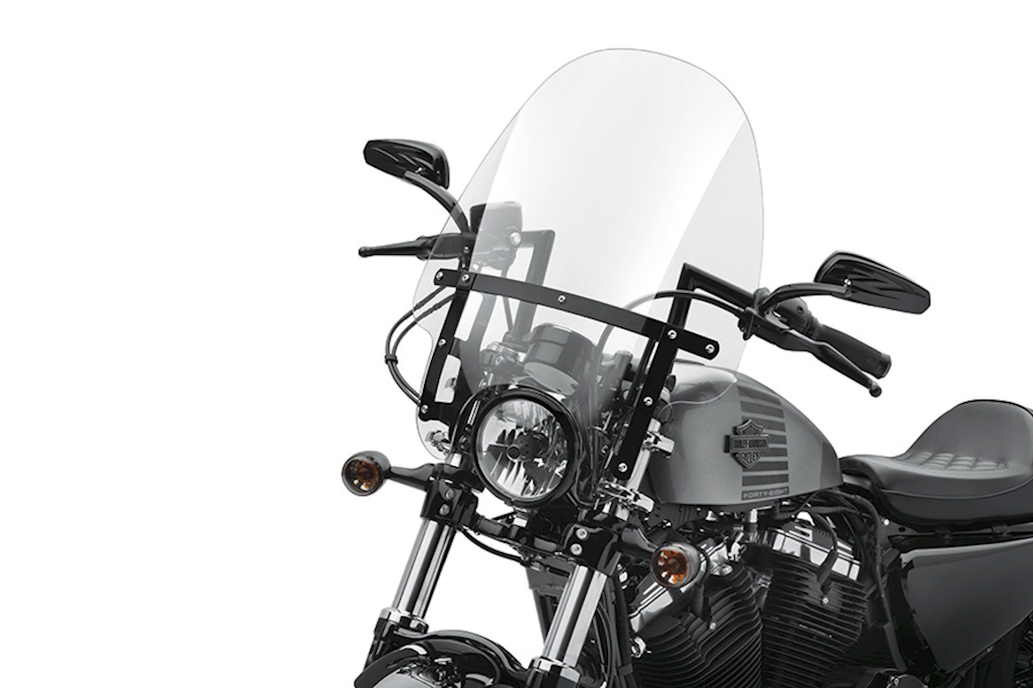 Combine the classic Harley-Davidson∏ windshield shape with a revolutionary new attachment system and you have the best of style and function. The windshield mounts to the fork tubes with elegant die-cast lever-release clamps, so the windshield does not require any "leave-behind" docking hardware. You get quick on-and-off convenience and a clean, custom look. No tools are required and the kit includes everything needed to install the windshield. The tough, hard-coated polycarbonate windshield is available with traditional polished or gloss black horizontal and vertical braces. Fits '16-later XL1200X models.