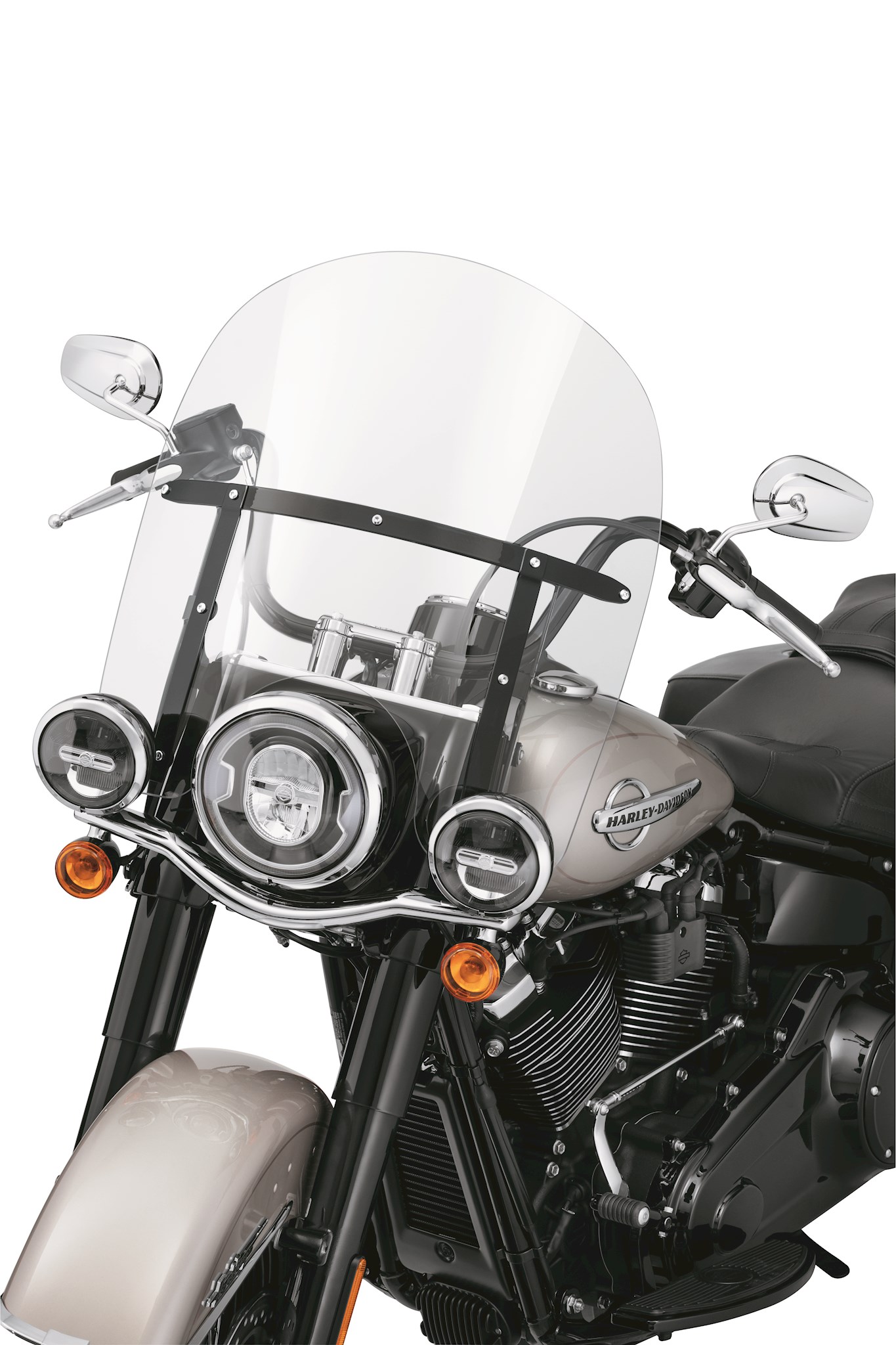 Nothing gets past this one. The King Size windshield is the ultimate in on-road protection. This full coverage shield creates a clean managed flow of air over and around the rider and passenger, and because it is designed to be installed or removed in seconds without tools, a detachable windshield gives you the freedom to define your ride at the drop of a hat. Ride across the country protected from the elements, then quickly remove the windshield to hit the streets in style. This one-piece windshield is formed from hard-coated polycarbonate material to resist scratching. The shield is attached to stainless steel mounting brackets supported by molded-rubber bushings for improved isolation. Windshields are available in a variety of heights to match your size, and with traditional polished or contemporary gloss black braces to match your bike's finishes. Kit includes mounting hardware. Fits '18-later FLDE, FLHC and FLHCS models.