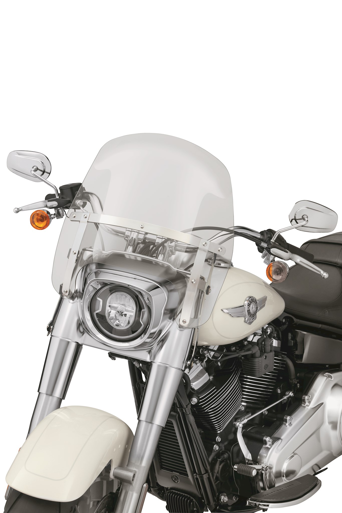 Shaped to divert headwinds around the rider, this compact windshield moderates the air pressure against your chest and reduces the strain on your arms during a long highway ride. Designed to provide the riding comfort of a larger windshield, this Wind Splitter Windshield features flipped upper edge to manage the airflow and turbulence across the top of the shield. The flip adds additional wind shear lift to provide the protection of a taller wind screen. The compact size is the perfect compromise between function and style on the road, and the detachable design means you can ride without the shield when you prefer a wind-in-the-hair experience. The hard-coated polycarbonate windshield mounts to the fork triple trees with rubber isolators to reduce vibration and to provide quick tool-free on-and-off installation. Kit includes all mounting hardware. Fits '18-later FLFB and FLFBS models.