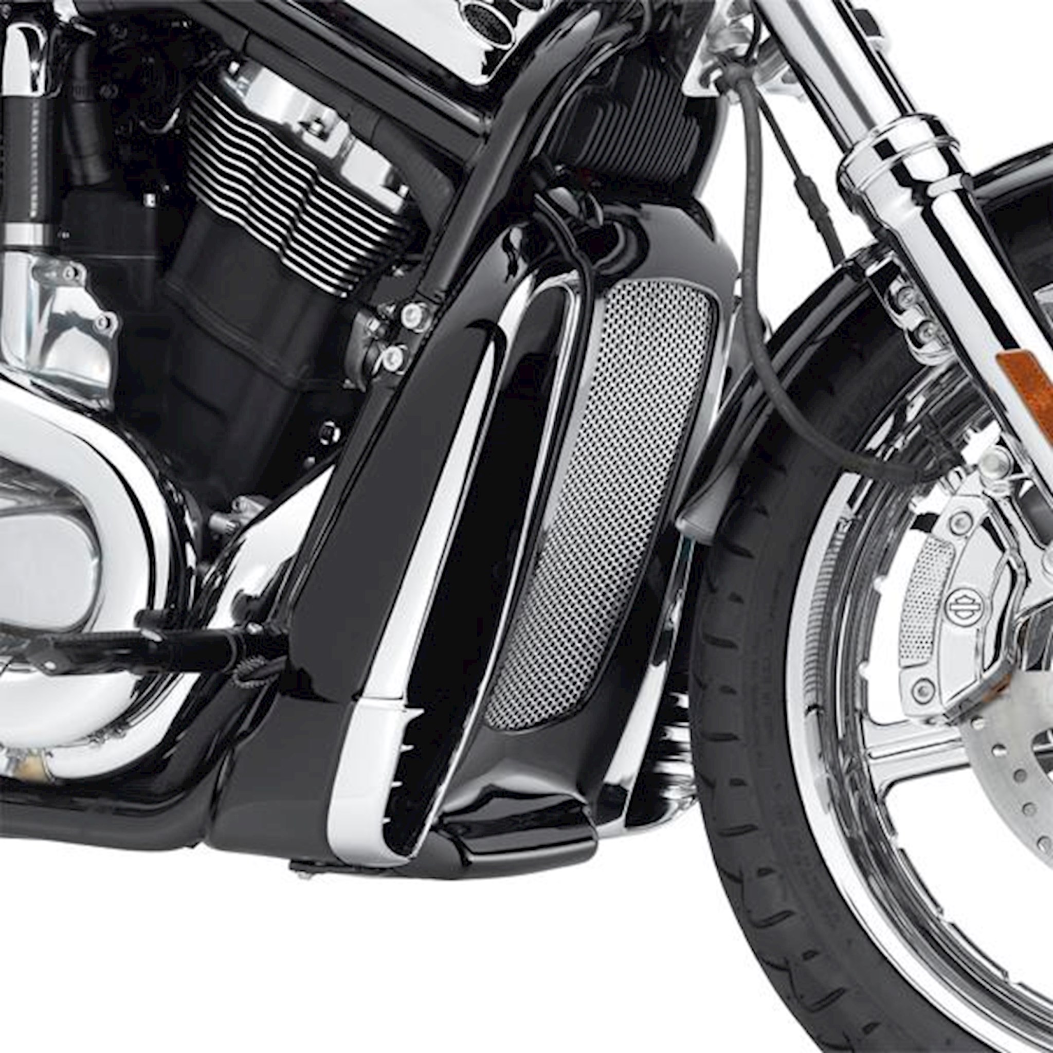 This Radiator Cover incorporates a scooped chin spoiler and chrome-plated perforated screen for a racy, custom appearance. Manufactured from high-impact composite materials, the insert covers the Original Equipment center section and stretches the color of the radiator end caps across the front of the bike. Kit includes the necessary hardware for quick and easy installation.