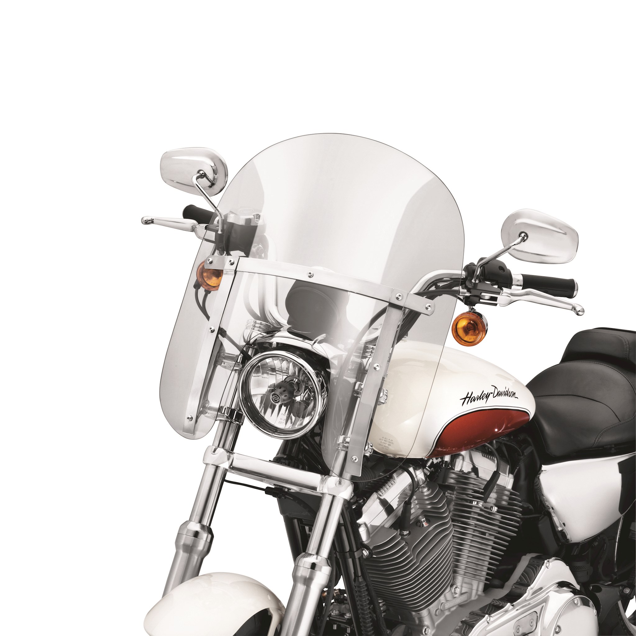 Combine the classic Harley-Davidson∏ windshield shape with a revolutionary new attachment system and you have the best of style and function. The windshield mounts to the fork tubes with elegant die-cast lever-release clamps, so the windshield does not require any "leave-behind" docking hardware. You get quick on-and-off convenience and a clean, custom look. No tools are required and the kit includes everything needed to install the windshield. The tough, hard-coated polycarbonate windshield is available with traditional polished or gloss black horizontal and vertical braces. Fits '14-later XL1200T and '11-later XL883L and XL1200C models.