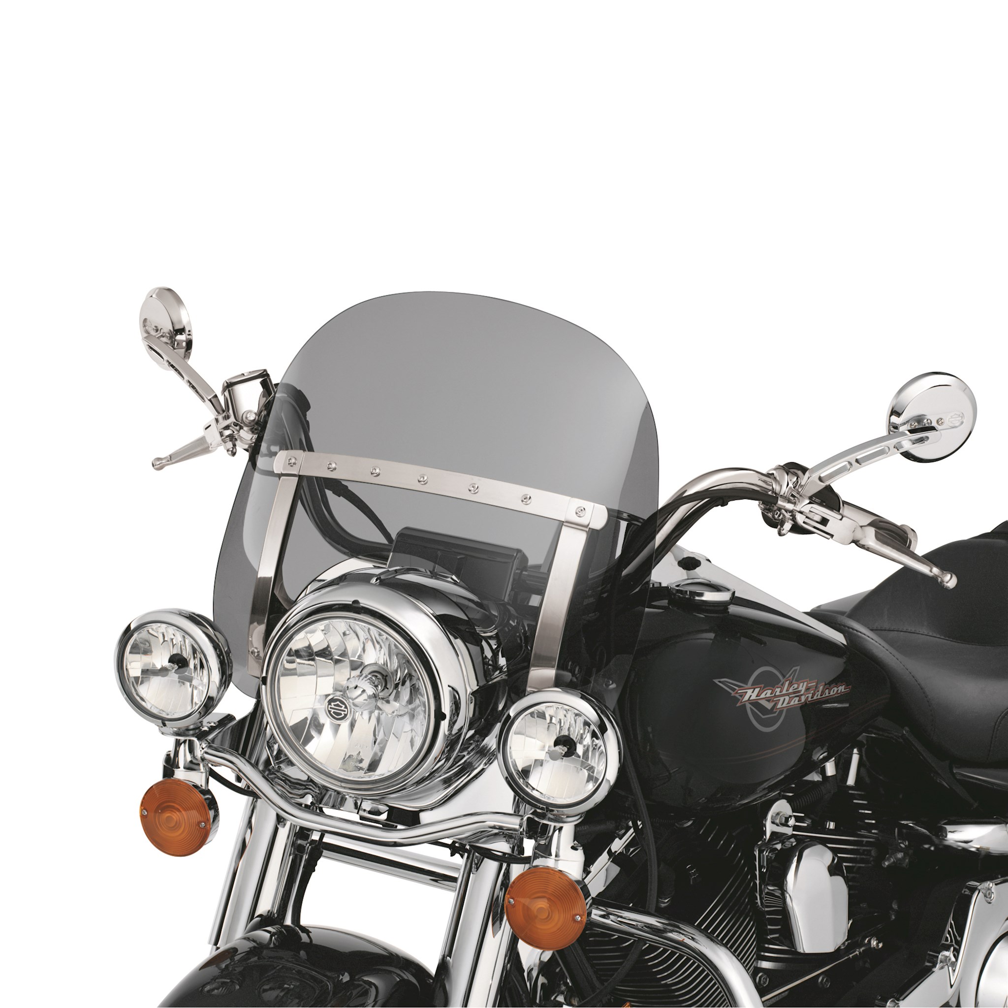 Keep the wind and glare out of your eyes with this Smoked Wind Deflector. This dark smoke detachable mini-shield follows the form of a traditional Harley-Davidson® Road King windshield, but its much smaller size adds a touch of low-down attitude.